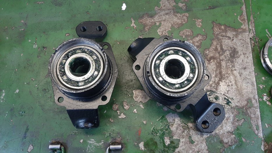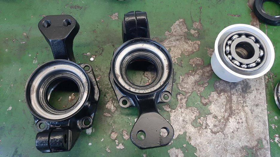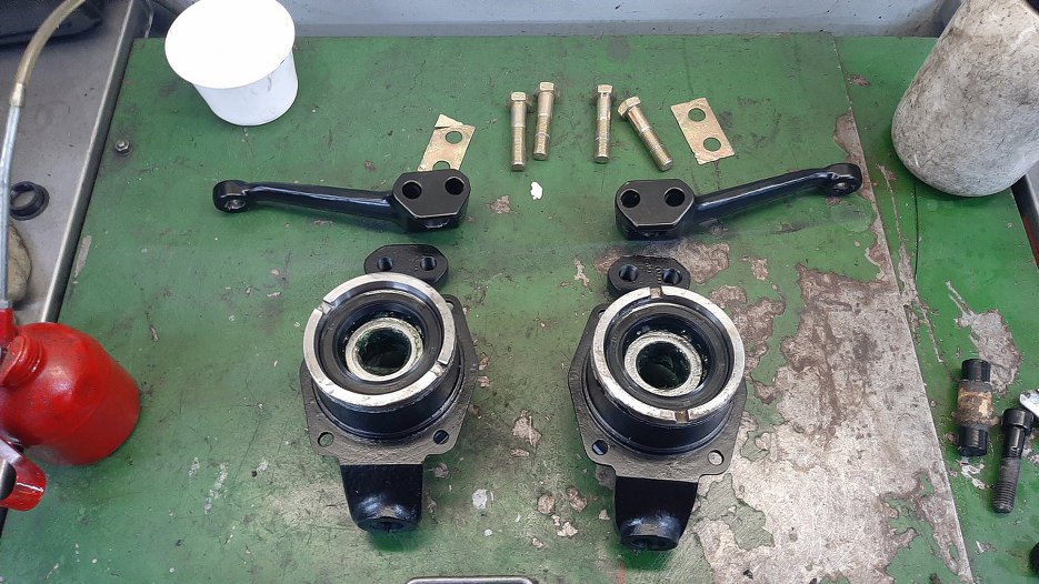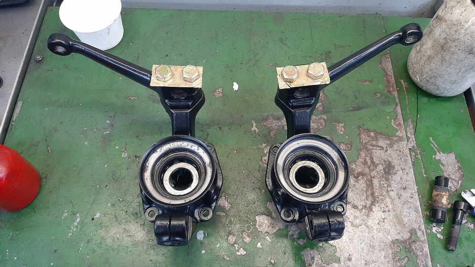 Nakrętki trzymające łożyska już przykręcone. U góry przygotowane ramiona zwrotnic.