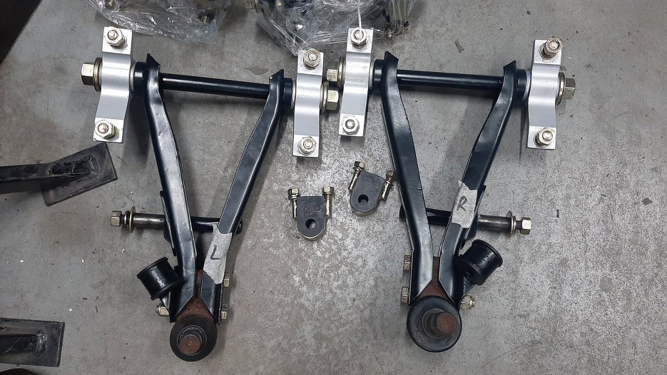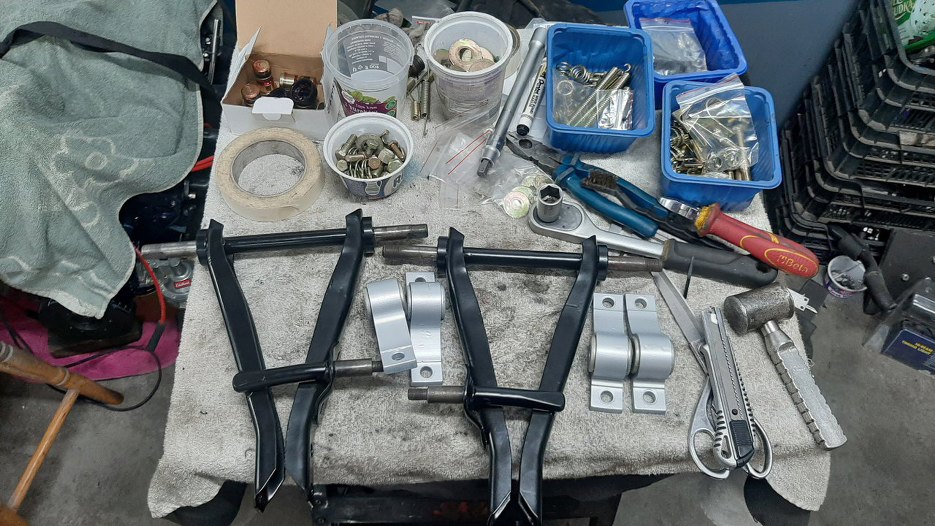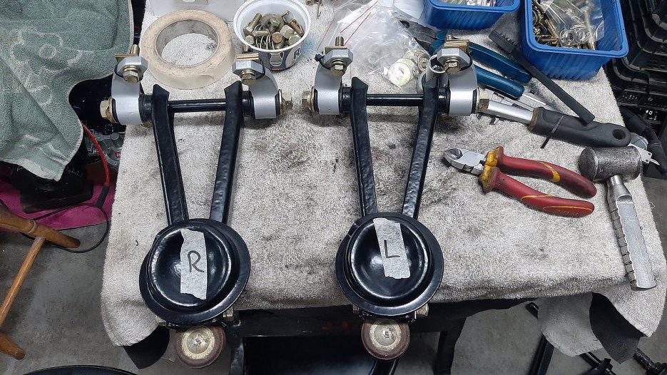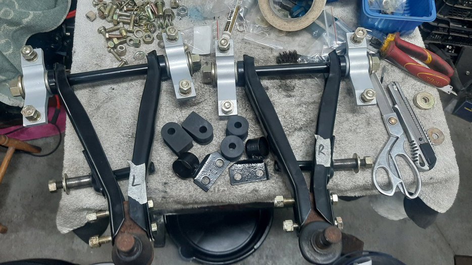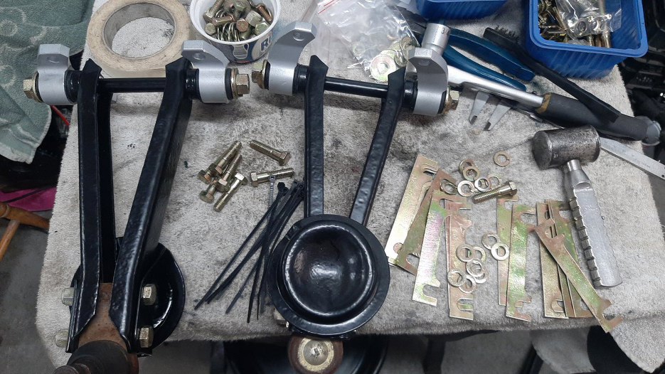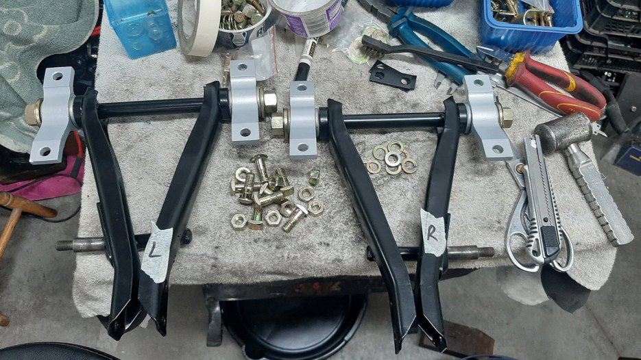 Przykręciłem mocowania do wahaczy. Po prawej widać podkładki regulacyjne geometrii zawieszenia. Oznaczyłem je wcześniej, więc teraz mogą trafić na swoje miejsce. Oczywiście potem i tak trzeba będzie geometrię zrobić, ale na początek będzie to jakieś ustawienie wyjściowe.