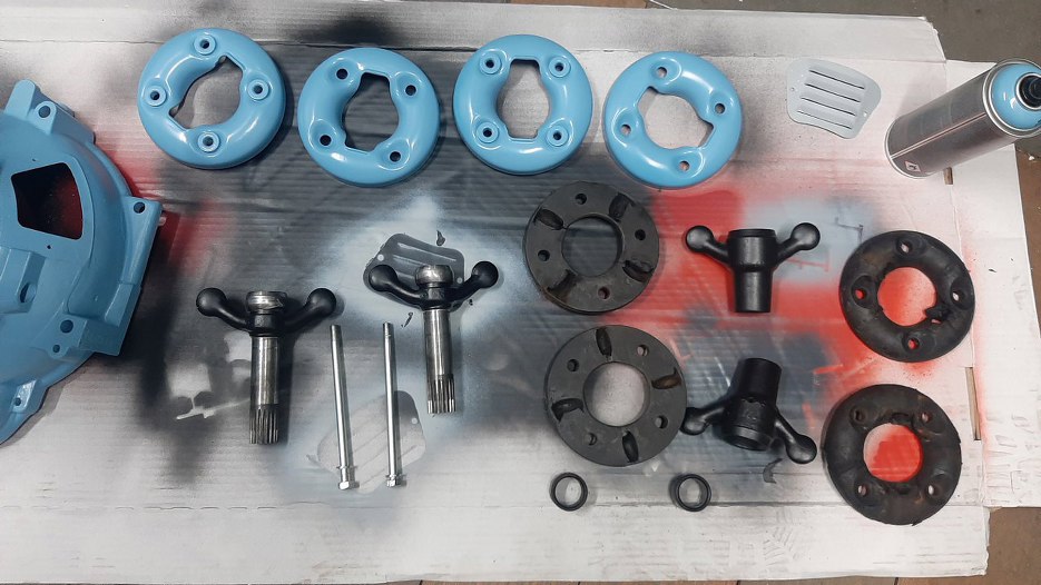 Konstrukcja tych przegubów jest dość prosta - wypustki trafiają w miejsca w elementach gumowych, a całość skręca się z dwóch połówek. Gumy są tutaj elementem eksploatacyjnym, ale jeszcze są dobre, więc zostają.