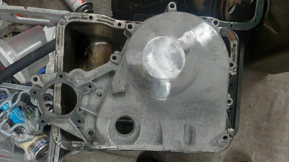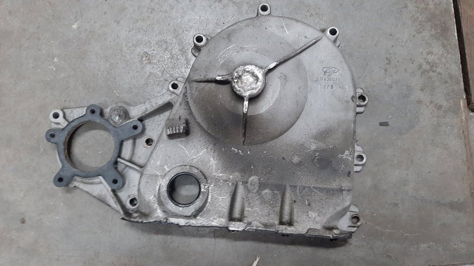 Trochę ten etap prac się przeciągnął, stąd nieco opóźniona aktualizacja. Niby wszystkie części były, ale w większość z nich trzeba było włożyć sporo pracy, aby można ich było użyć. Weźmy na początek pokrywę rozrządu. Ma zaspawany otwór po łożysku wiatraka chłodnicy, który nie będzie tu użyty. No niby ok i można założyć, ale ja jestem pedancik i nie mogę tego tak zostawić.