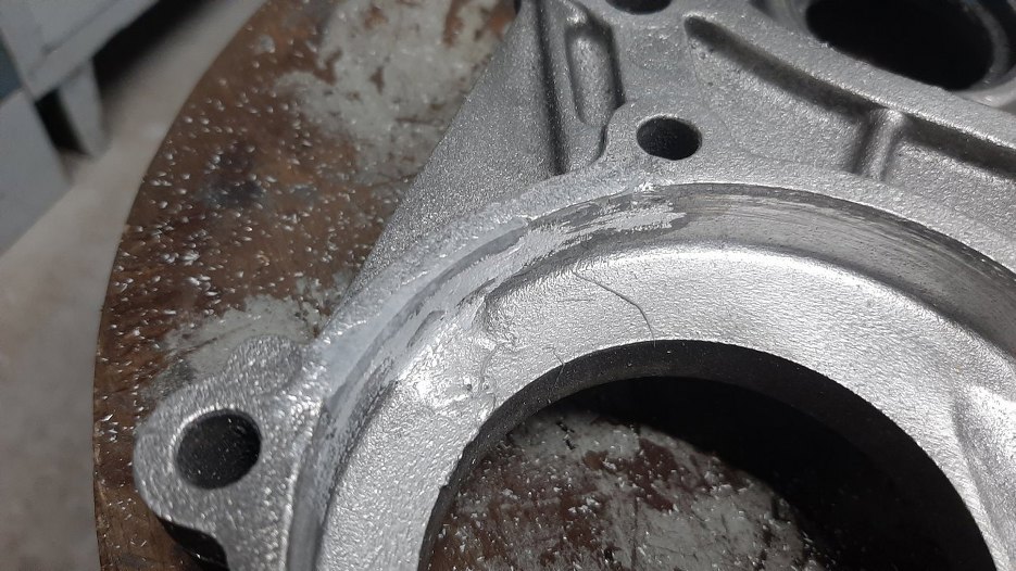 Jeszcze jedna sprawa. Obudowa pompy wody w tej pokrywie była już trochę wyżarta, zwłaszcza na płaszczyźnie uszczelki. Tu stwierdziłem, że zamiast spawać spróbuję zakleić to specjalnym klejem Loctite do naprawy odlewów. Tu widać po zaklejeniu i wstępnym uformowaniu na miękko.