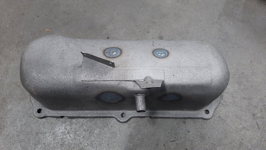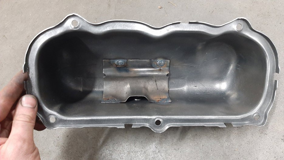 Potem wszystko oczyszczone zostało z resztek piachu i chropowatości szczotką drucianą. W tej pokrywie jest jeszcze separator par oleju, czyli wspawana blaszka. Tą blaszkę odciąłem - była już wcześniej odwiercona i wspawana. Dzięki temu oczyściłem każdy zakamarek tej pokrywy.