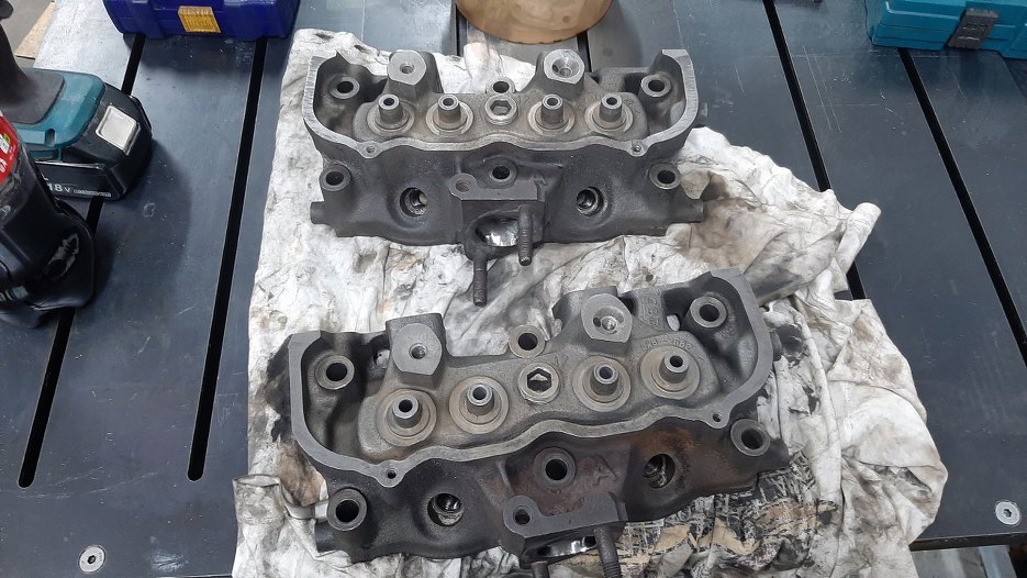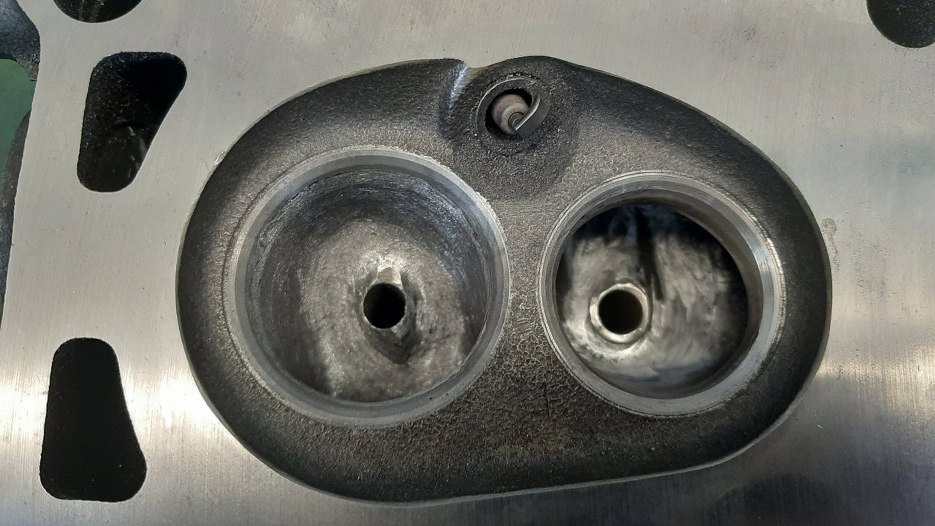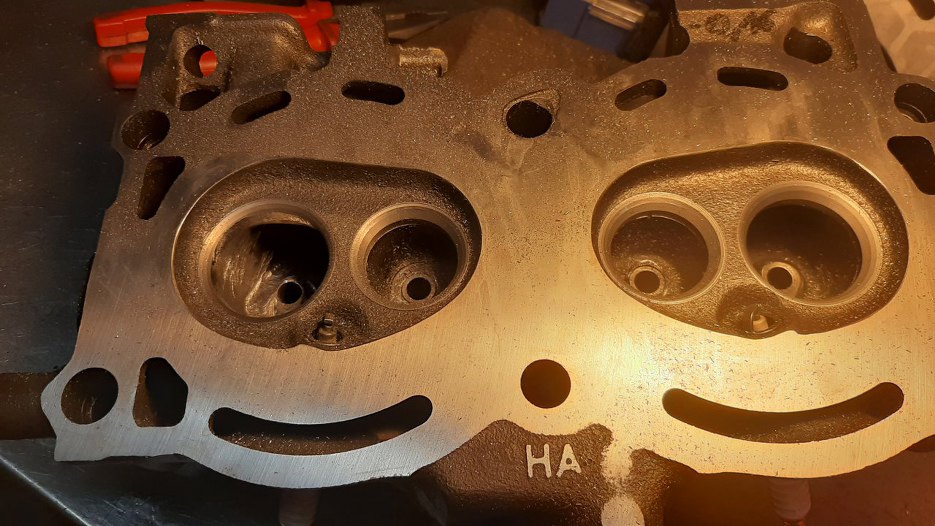 W międzyczasie obrobione zostały głowice. Głównie były splanowane, i to dość sporo - żeby płaszczyzna była gładka, potrzeba było zdjąć 0.2mm. I to nie było pierwsze planowanie tych głowic... Ponadto Bartek podjął decyzję, że chciałby większe zawory. Wzięliśmy zawory z 2.3 V6 Forda, ale późniejszego. Ma o 2mm większe średnice zaworów niż wczesny 2.3, który ma te same co 1.5/1.7 V4. Widać po gniazdach zaworowych o ile większy przelot dzięki temu będzie. Na razie go oczywiście nie ma, bo kanały są za małe...