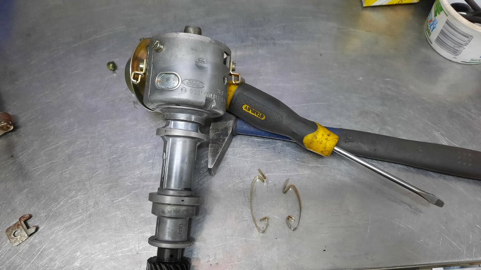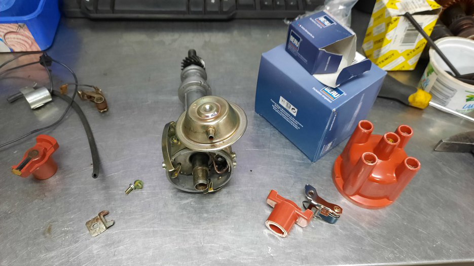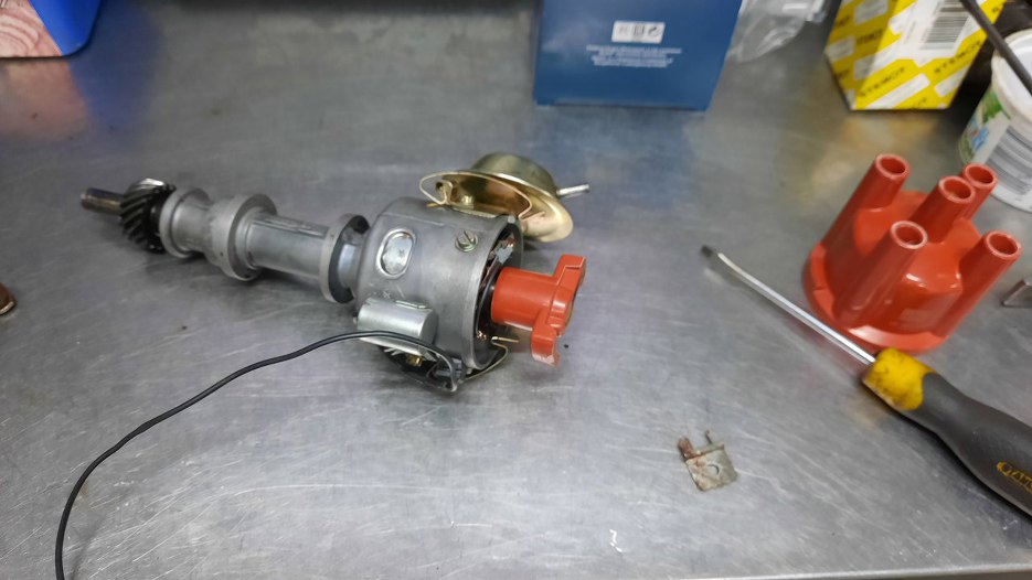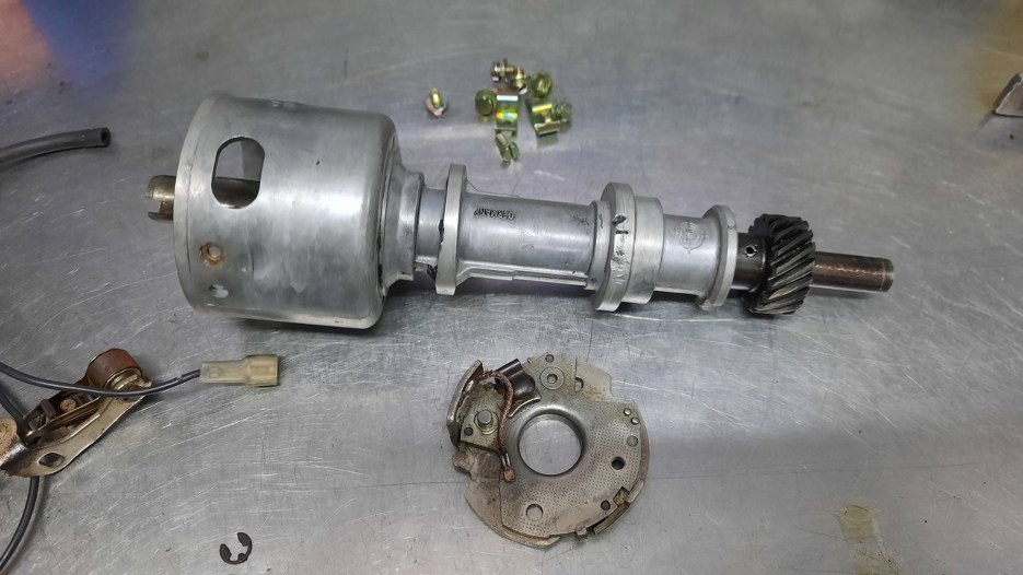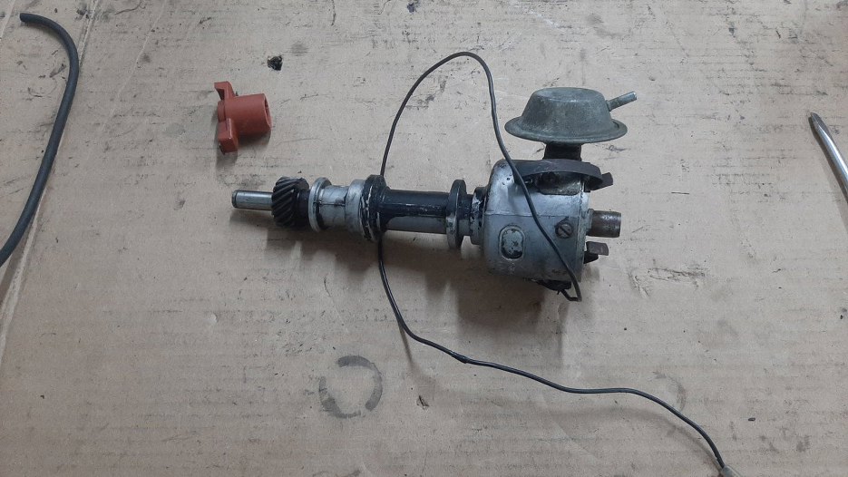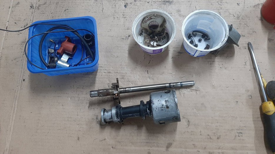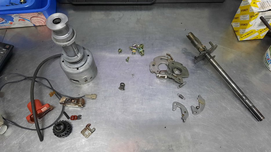 Póki co mam nawałnicę projektów w garażu, dlatego ten silnik nieco został zaniedbany, ale już do niego powoli wracam. Zanim będę miał więcej miejsca na ogarnianie dalej silnika, zrobię co nieco osprzętu. Oczywiście wszystko te ileś lat temu, jak było rozkręcane, było sprawne. Niestety, ja tego tak nie mogę zostawić. To, że jest zapyziałe, to jedno, ale żaden element osprzętu nie nadaje się do założenia. Na przykład aparat zapłonowy, którym się teraz zajmę - w środku mechanizm jest już praktycznie nieruchomy, bo stary olej stał się klejem. Nie ruszają się ani ciężarki, ani płytka opóźniania zapłonu pod wpływem podciśnienia. Zatem rozkładam.