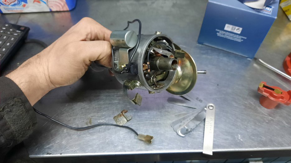 Ze starych nadawał się do montażu jedynie kondensator, bo wygląda na niedawno wymieniony. Po uruchomieniu silnika może się jednak i on okazać do wymiany, ale póki co zostaje. Zamontowałem przerywacz i wyregulowałem przerwę na stykach.