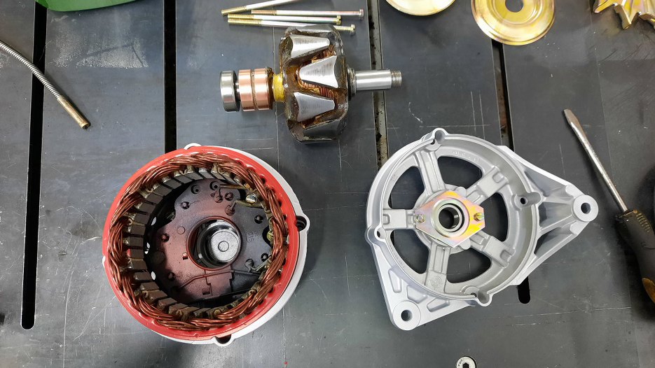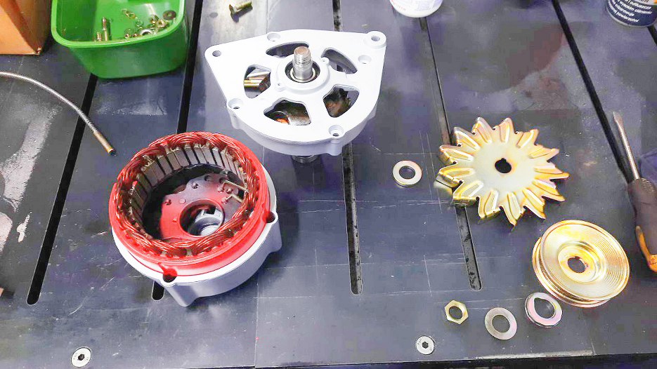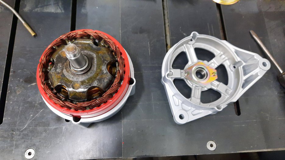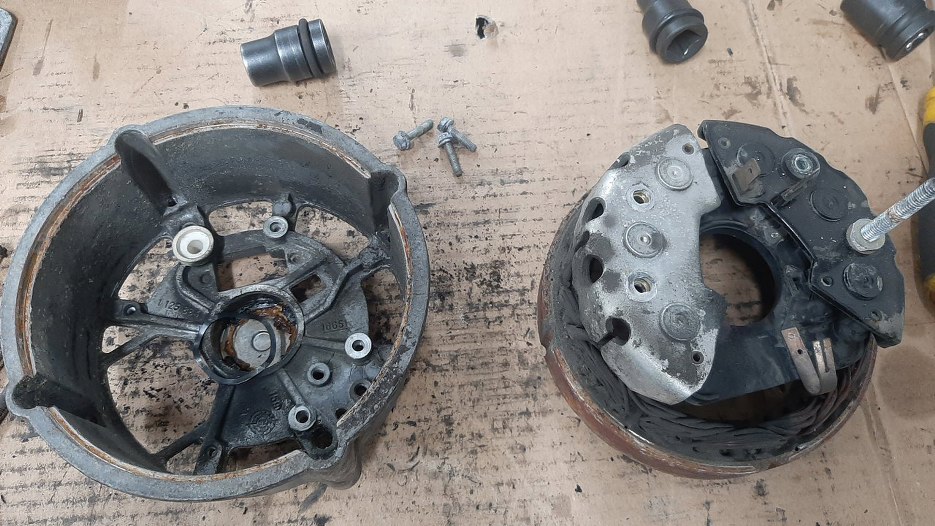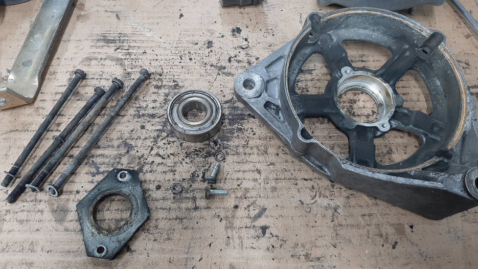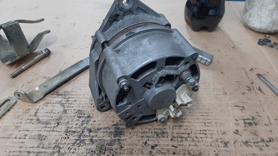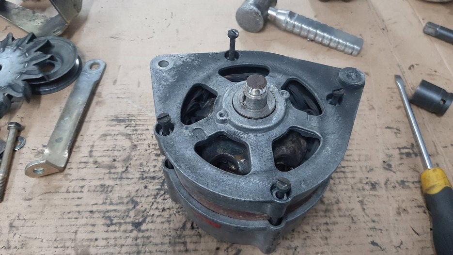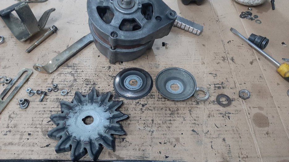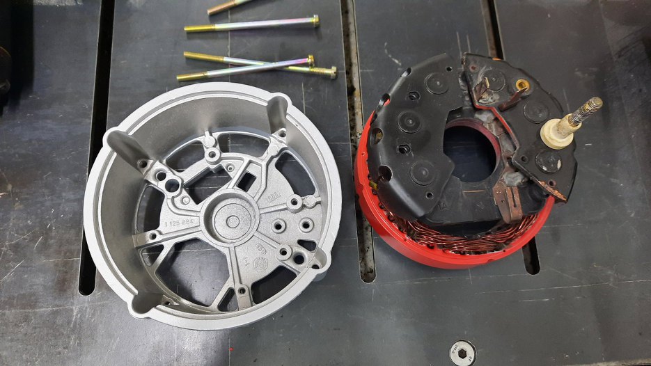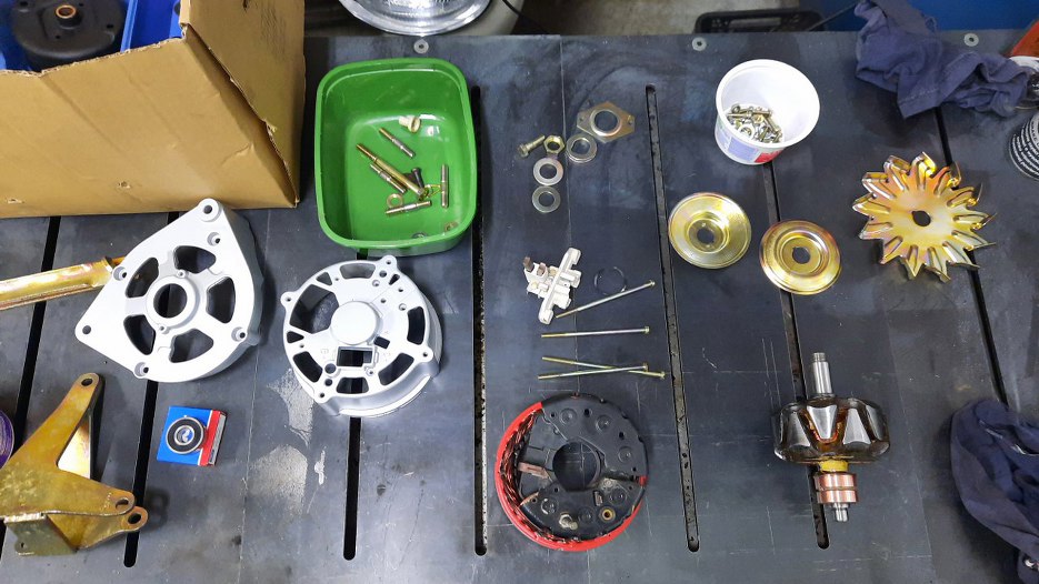 Kontunuuję temat osprzętu, skoro tak dobrze idzie. Osprzęt Bartek przywiózł luzem w pudełku. Teoretycznie wszystko było działające, gdy było zdejmowane z silnika, ale w praktyce wygląda to tak, że warto zajrzeć do środka, bo nie wiadomo co tam znajdę. Zresztą na przykład alternator już miał chrzęszczące łożyska.