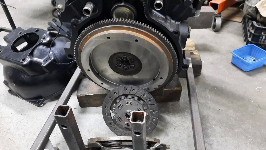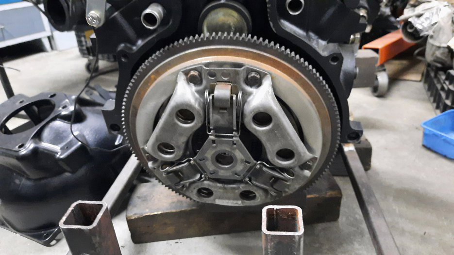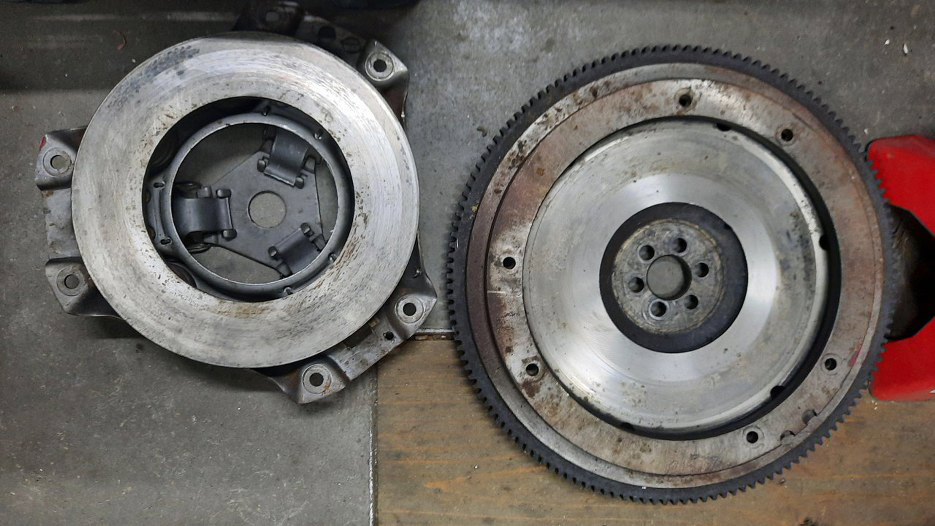 Odgrzebałem też koło zamachowe i sprzęgło. Tarcza była ok, prawie nowa, ale docisk i samo koło nie miały równych płaszczyzn. Ponieważ trudno się do tego dostać już po zamontowaniu silnika, trzeba będzie to poprawić.