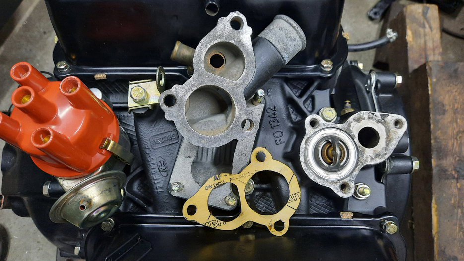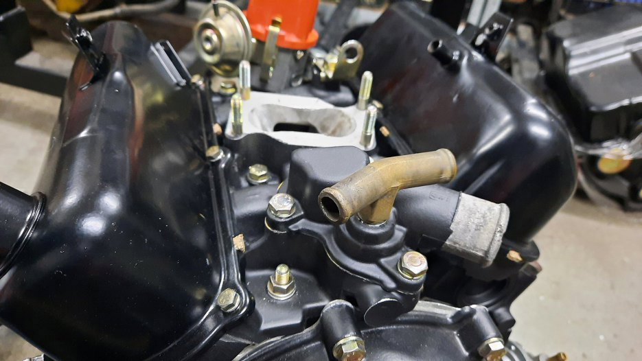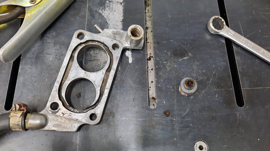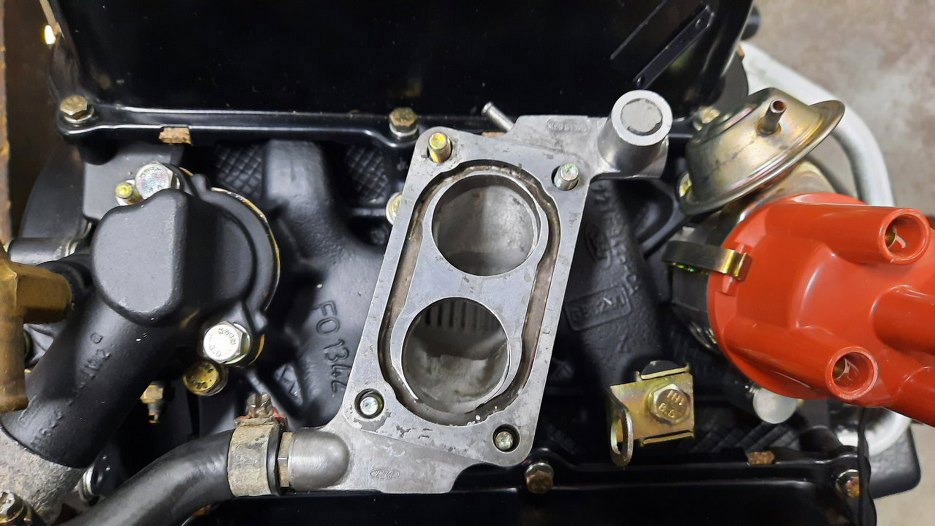 To może teraz gaźnik? Pod gaźnikiem jest podstawka, której zadaniem jest dostarczenie podciśnienia - do serwa hamulcowego (króciec i rurka po lewej dolnej stronie zdjęcia) i do odmy - po prawej górnej. Tu, jak widać, nie ma wkręconego zaworka odmy, tylko obcięta śruba jako zaślepka. Ponieważ ja lubię działające odmy, to muszę coś z tym zrobić.