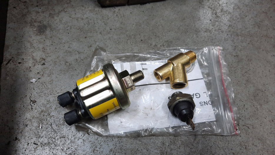 Bartek też chciał mieć podłączony dodatkowy zegar pokazujący ciśnienie oleju. Żeby nie stracić kontrolki ciśnienia oleju wymyśliłem taki trójnik, który nawet udało mi się znaleźć gotowy. Pasuje w otwór w bloku i pasują do niego czujniki.