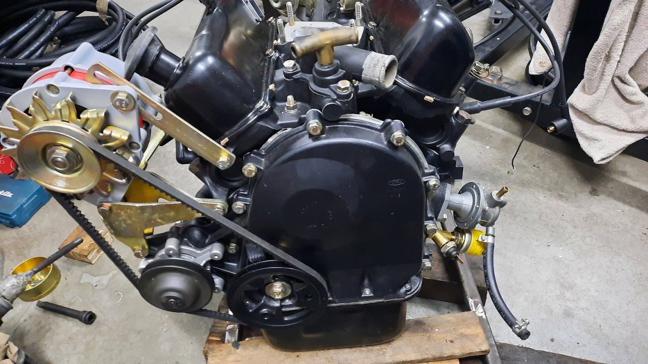Założyłem pasek klinowy. Jest krótszy niż oryginalnie, bo, przypominam, jest tu usunięte łożysko z obudowy rozrządu i nie ma tam kółka pasowegi i wiatraka. Wiatrak będzie elektryczny na chłodnicy.