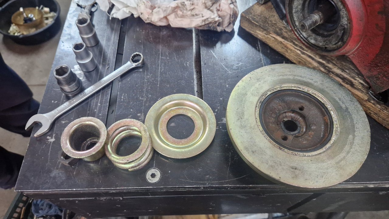Z przodu odkręciłem nakrętkę trzymającą koło pasowe i zdjąłem cały zestaw.