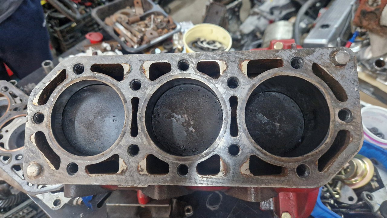 Zacznę może od historii, dlaczego w ogóle ten silnik do mnie trafił. Ogólnie samochód jeździł nieźle, ale ciężko było go uruchomić. Jest to dwusuwowy silnik 850cm3, po tuningu, z fabryczną pompą oleju (nie trzeba robić mieszanki) i trzema gaźnikami. Kiedyś miał już robiony remont. Po tuningu jeździł też nieźle, ale dopiero jak pojawiły się problemy, podjęte były próby regulacji i zmiany dysz w gaźnikach. Były podejrzenia, że przestawia się zapłon (podobno jak nie ma smarowania z pompy oleju, to odpina się napęd aparatu zapłonowego, żeby oszczędzić silnik, ale ja tego nie stwierdziłem w środku). Diagnozowałem i to, ale to nie był zapłon. W końcu coś mnie tknęło i zmierzyłem ciśnienie sprężania... 10, 6 i 8 bar. No nie do końca tak ma być.