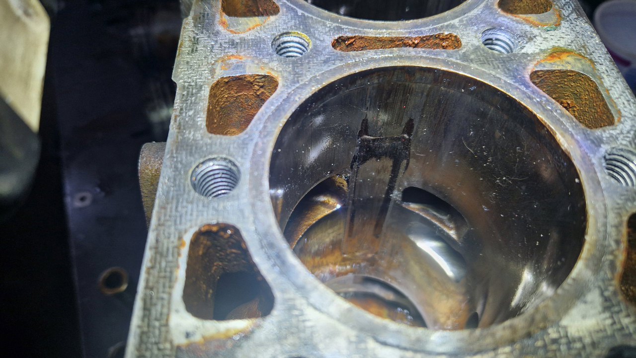 Brak pierścieni Segera spowodował przesuwanie się sworzni, które wyryły spore rysy w ściankach cylindrów.