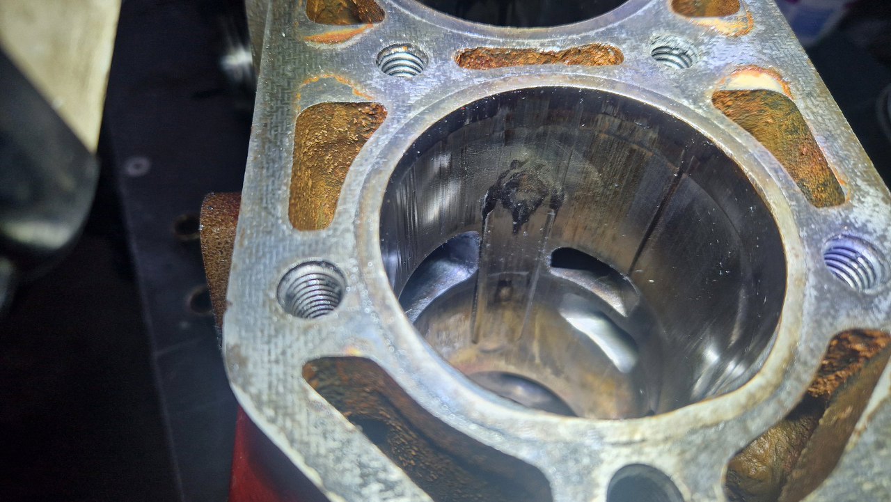 A tu prawdopodobna przyczyna. Zatarcie mogło być już skutkiem awarii, ale stopić tłoka to samo tarcie nie da rady. To musiało być spowodowane ubogą mieszanką (gaźniki po tuningu nie były strojone, dopiero później). Zazwyczaj jednak uboga mieszanka powoduje topienie się denka tłoka, albo okolic pierścieni. Tu jestak mamy dwusuwa, z oknami dolotowymi, i z drugiej strony bloku widać, że rysy od sworzni są bardzo blisko kanałów wydechowych.