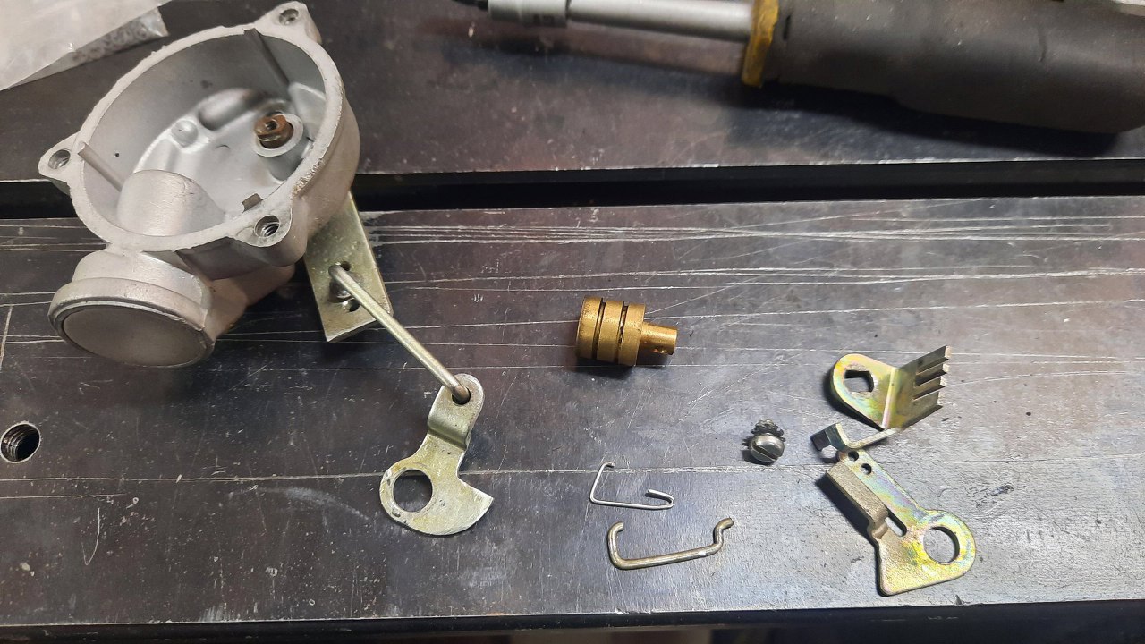 No i zabieram się za poprawienie mechanizmu ssania. Najpierw wyprostowałem blaszkę przy tym grzebyku, wzorując się na oryginalnym elemencie w drugim gaźniku. Pręcik łączący tłoczek znalazłem w częściach zapasowych. Widać, że dorobiony był cieńszy i za krótki.