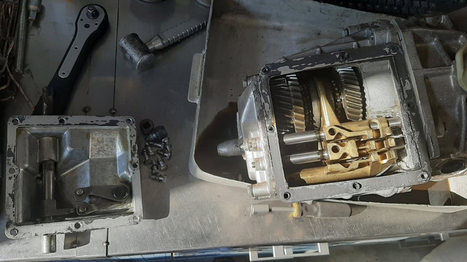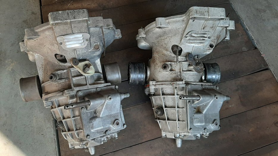 Mamy tu dwie skrzynie biegów, ta po prawej jest trochę późniejsza niż ta, co bezpośrednio zastąpiła dwusuwową, już nieco mocniejsza. Po lewej - późniejsza skrzynia, jeszcze bardziej wzmocniona. Trochę widać czym się różnią.