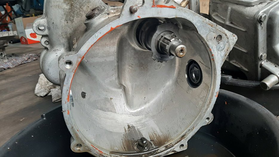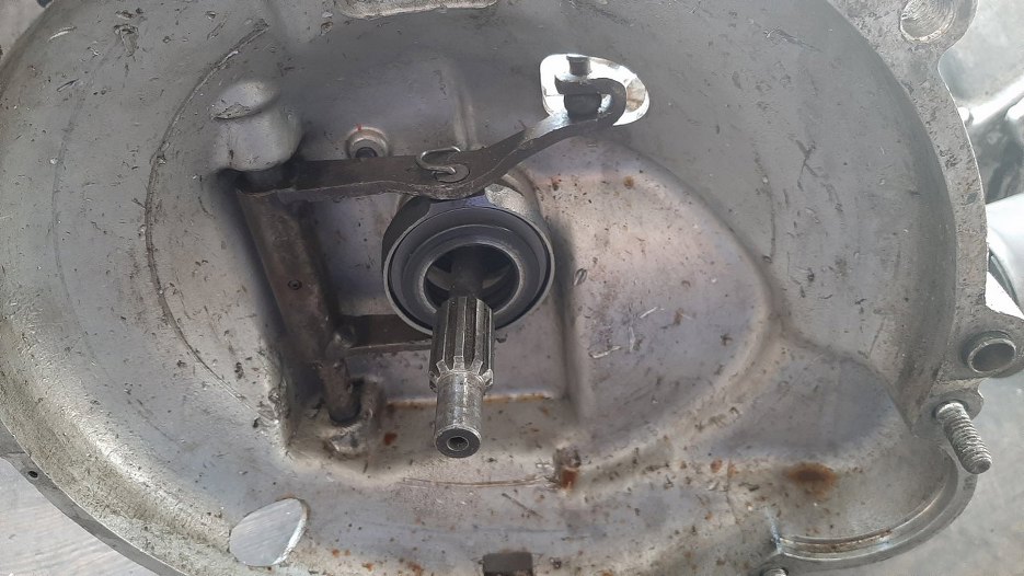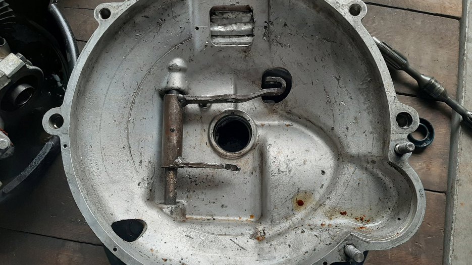 W obudowie sprzęgła skrzyni wyjętej z komory silnika widać też pamiątki ze zmielenia sprzęgła, o którym wspominał właściciel.