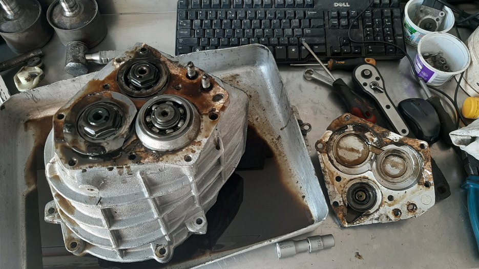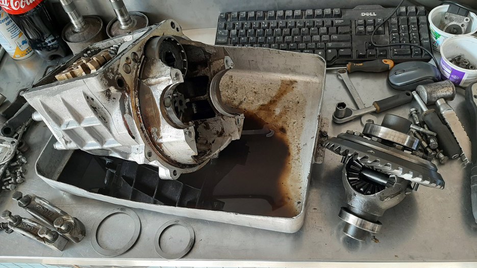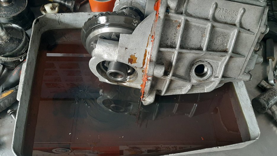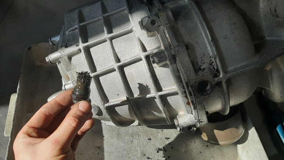 Otworzyłem też tą skrzynię, co była na aucie. Miała wlany świeżutki olej, ale na końcu zlał się z niej również szlam.