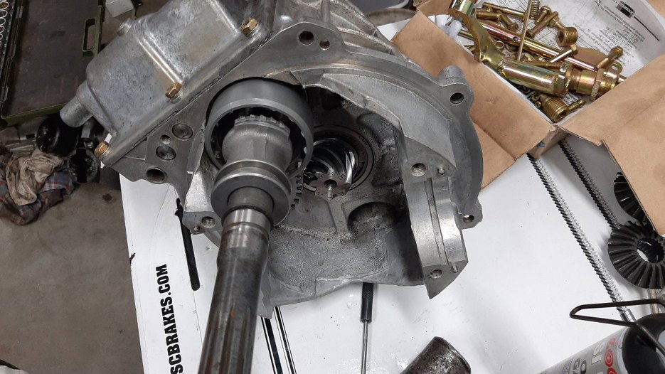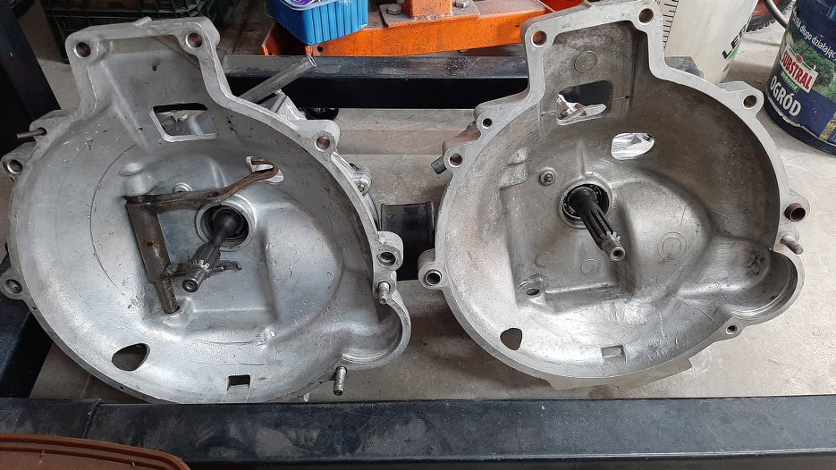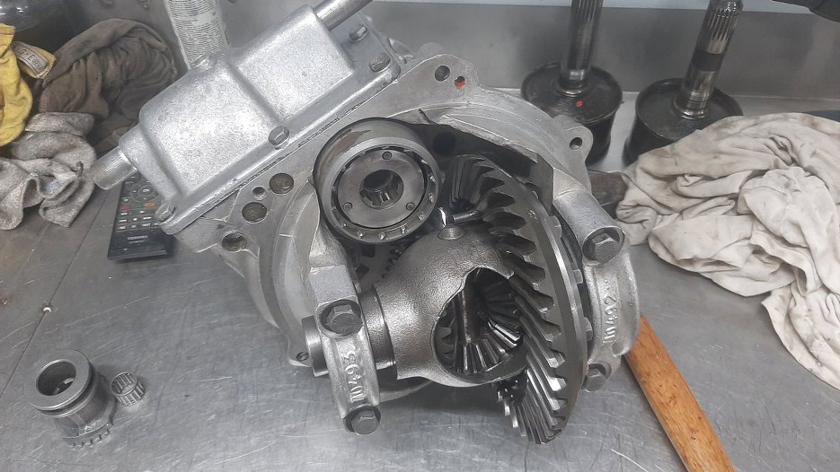 Obudowa mechanizmu różnicowego przykręcona i półośki założone. Tu zostały stare simmeringi, bo nie ma co na razie inwestować w tą skrzynię, a łatwo jest je wymienić w razie czego.
