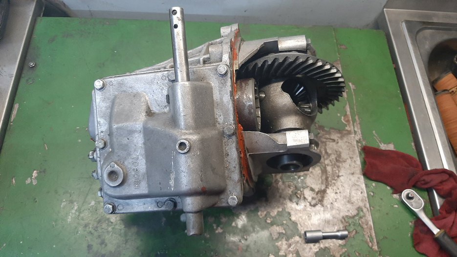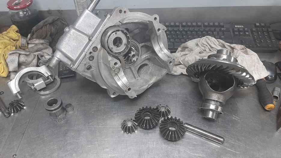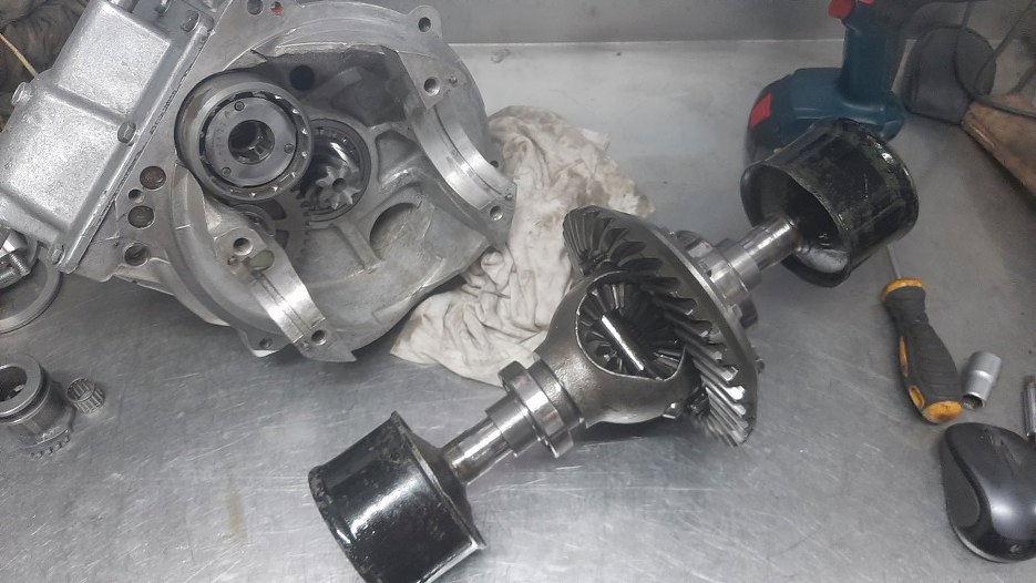 Druga skrzynia biegów ma trafić na razie na półkę, ale ma być ewentualnym zapasem, więc też trzeba ją przygotować tak, żeby była gotowa jak przyjdzie co do czego. Tu widać, że zdjąłem już obudowę mechanizmu różnicowego i odkręcam podpory kosza satelit.