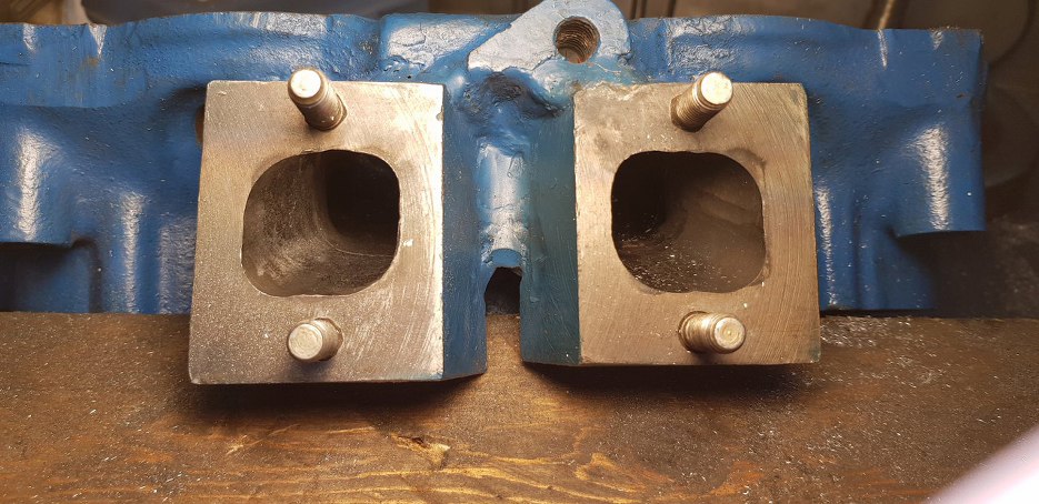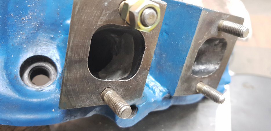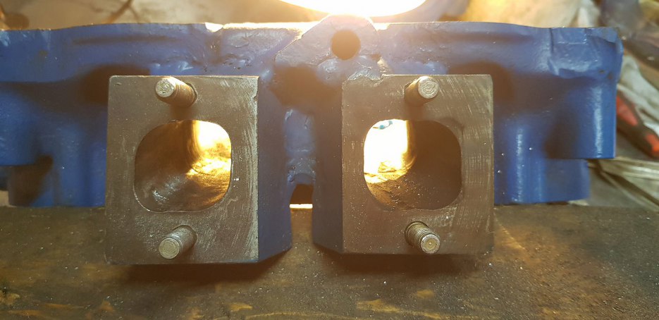 Tu widać wstawione klocki po stronie wydechowej. Resztka starego wydechu widoczna jest pomiędzy tymi klockami u góry.