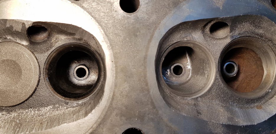 Tu kanał wydechowy (po prawej) po obróbce. Widać, że udało się zdecydowanie powiększyć cały kanał, zbierając materiał po obwodzie. Teraz kanał ma przelot taki, jak wstawione gniazdo zaworowe. Kanał ssący widać, że wciąż... no coż, ssie.