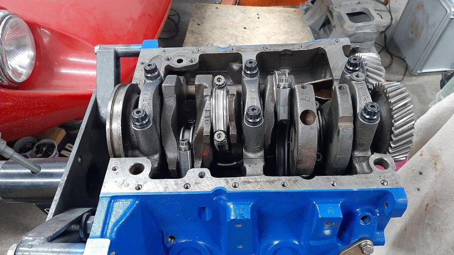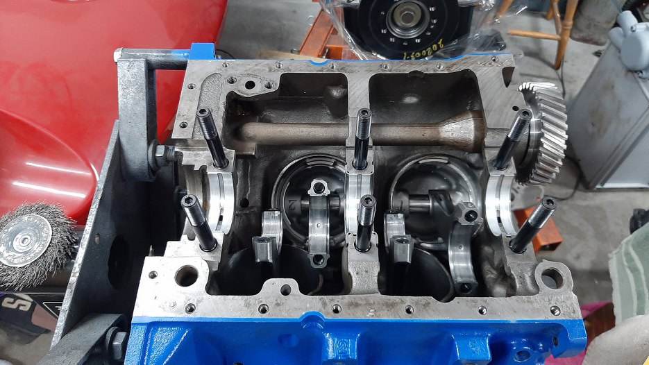 Żeby wyjaśnić co się właściwie stało z blokiem muszę się trochę cofnąć z historią. Na 6 stronie pokazałem, że złożyłem wał korbowy. Prawda jest taka, że włożyłem, ale nie do końca wszystko było w porządku. Dokręcając stopy wału nie dokręciłem dwóch śrub - czułem, że obracam nimi dalej, niż powinny być dokręcone. Czyli że gwint się urywa w bloku. Słabo. Wymyśliłem, że można zastąpić śruby szpilkami ARPa. Wtedy dokręcanie jest po stronie nakrętki, a szpilka jest wkręcana bez siły praktycznie w gwint. I może gwint w bloku wytrzyma. Jeśli nie, to w zasadzie można by wywalić blok i wziąć następny... W każdym razie po dłuuuuuuuugim oczekiwaniu wreszcie przyszła przesyłka z GB ze szpilkami. W cholerę drogimi, jeśli mogę zauwazyć. Wyjąłem wał, bo po skręceniu tymi szpilkami siła trzymania jest większa i może powstać owalizacja stóp wału, więc trzeba to zmierzyć. Wkręciłem szpilki.