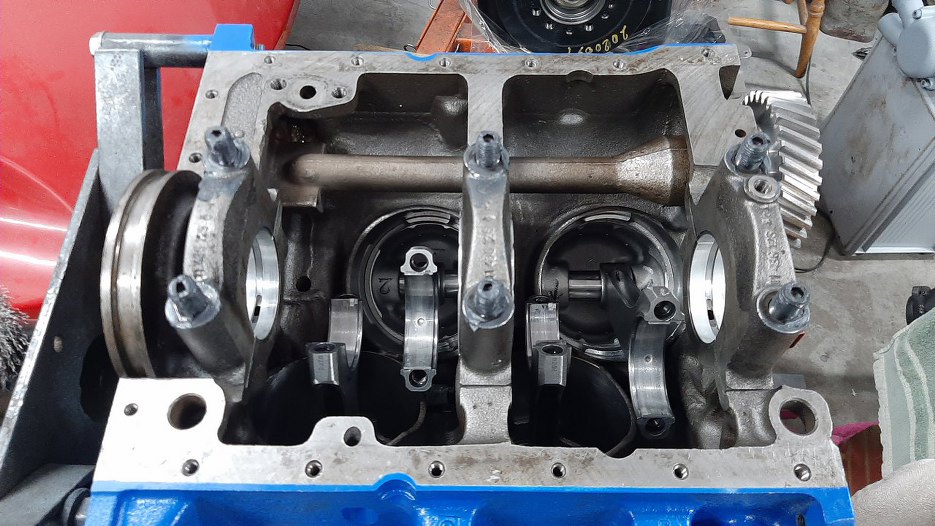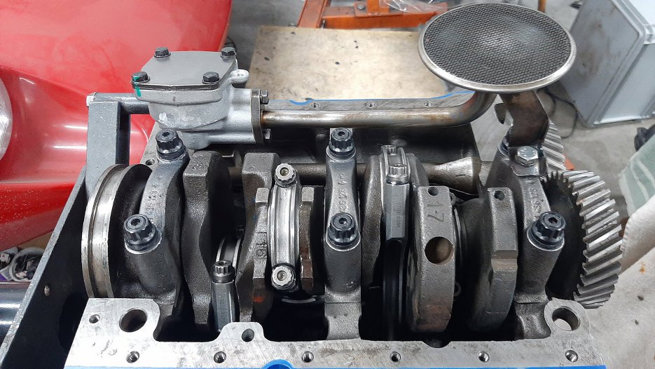 Przykręciłem jeszcze smok do pierwszej podpory wału. I tu ciekawostka - ponieważ V4 to jakby V6 bez dwóch cylindrów, to tu podpory wału mają numery - pierwsza "2", druga "3" i trzecia "4". Podpory są te same co w V6 :).