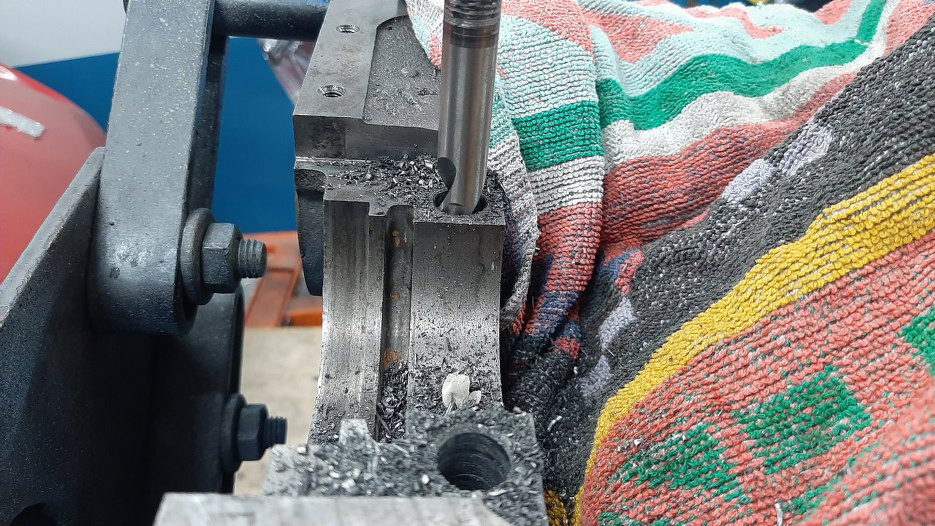 Chwila drapania się po głowie co by tu... W zasadzie mam drugi blok, ale trochę dużo obrabiania. Może jeszcze jakoś ten da się uratować? W sumie, mam zestaw Helicoili, używałem ich już kiedyś, może to nie byłby taki głupi pomysł? Co prawda stopy wału powinny być bardzo solidnie przykręcone, ale co może pójść nie tak? No to działamy. Zakryłem silnik szmatami i odwierciłem stare gwinty.