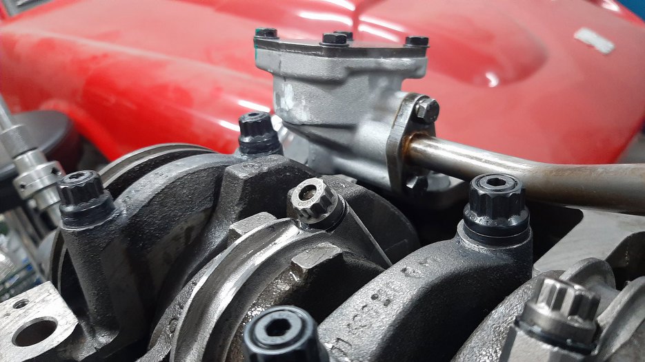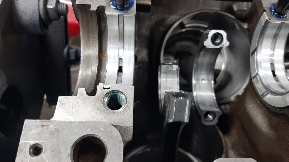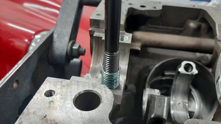 Wkręciły się ok, jeden gwint musiałem ponownie oczyścić gwintownikiem. Założyłem stopy wału i posmarowałem smarem ARPa. Dalej zdjęć nie mam, ale dokręcałem nakrętki momentem 30Nm, 60Nm, 90Nm i końcowo 122Nm. I przy ostatnim kroku wyciągnąłem dwa gwinty z bloku jego mać.