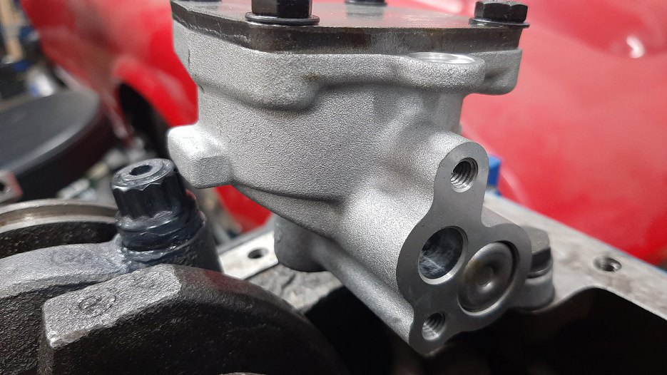 Przyłożyłem nową pompę na miejsce. Dobrze, że sprawdziłem, bo wystający element obudowy pompy zawadza o nowe szpilki. Gdybym to próbował dokręcić, to obudowa pompy by pękła.