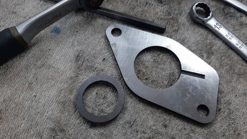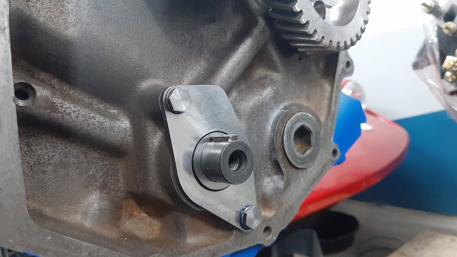 Płytka trzymająca wałek rozrządu była zużyta. Zazwyczaj zużywa się od strony koła zębatego, tutaj to zużycie było pogłębione tym, że dorabiane koło nie mieściło się pod pokrywą rozrządu i dodatkowo zostało dociśnięte do tej płytki. Ale była ta płytka też dość krzywa, więc została splanowana z obu stron - z widocznej strony, przylegającej do bloku, również. Ponieważ całkowity luz wzdłużny wałka rozrządu jest ustalany przez różnicę grubości tej płytki i podkładki na wałek widocznej obok, to ta podkładka też została odpowiednio zeszlifowana.