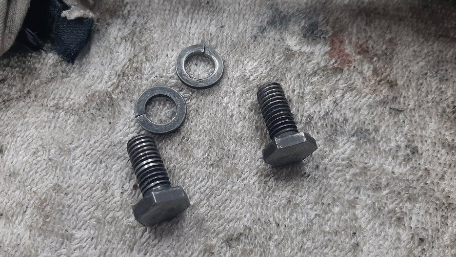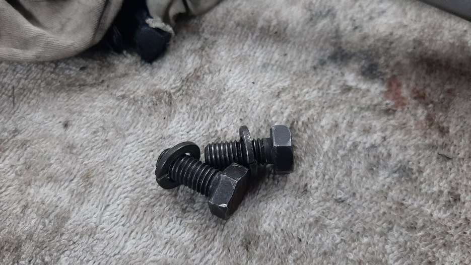 Kolejny drobiazg, to śruby mocujące tą płytkę i blachę pod pokrywę rozrządu. Wszystkie cztery są pod kołem rozrządu. Stare V4 miały zwykłe śruby, takie jak na zdjęciu. I w tym silniku takie były.