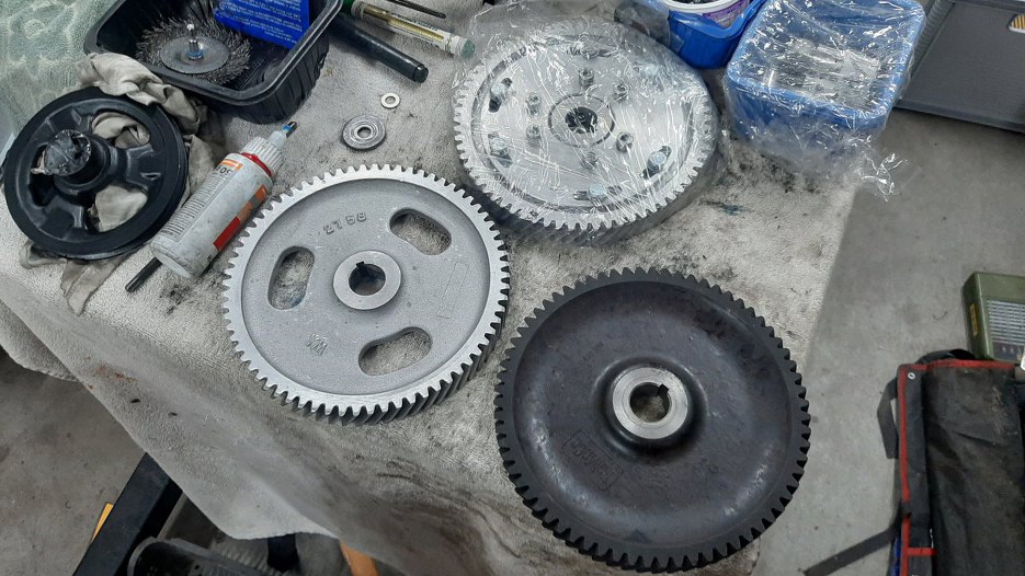 W bagażniku znalazłem też oryginalne, ebonitowe (czy jakieś) koło. Tego nie chcę używać, bo przy dużych oporach rozrządu (mogą być spowodowane przez strome krzywki wałka lub mocne sprężyny zaworowe) zęby mogą się zmielić.