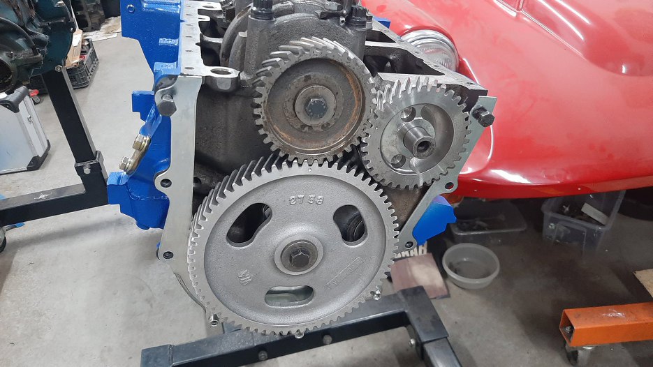 Założyłem koło rozrządu na wałek i dokręciłem. Koło wałka wyrównoważającego też nie jest oryginalne. Oryginalne miało zęby ebonitowe, to jest całe metalowe.