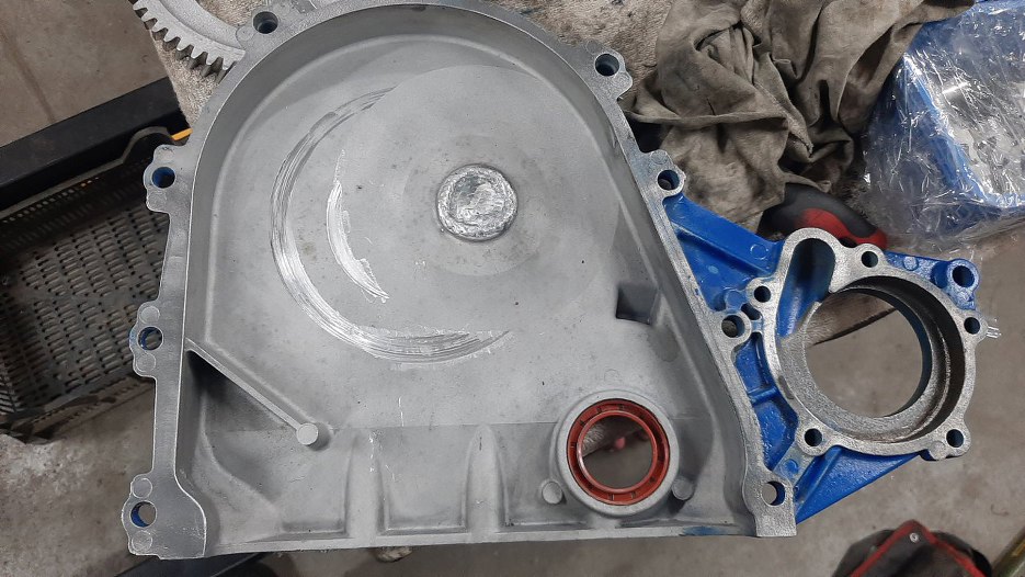 Pokrywę rozrządu umyłem wewnątrz, oczyściłem płaszczyzny pod uszczelki. Wydrapane ślady od koła rozrządu wyszlifowałem, żeby nie miały ostrych krawędzi. Simmering zostaje, jest świeżutki.