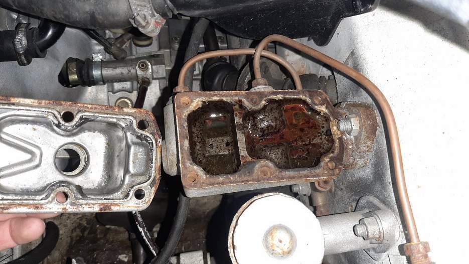 I już wydawałoby się, że wszystko jest na dobrej drodze do wyjścia na ostatnią prostą, gdybym nie nacisnął pedału hamulca. Razem z pedałem wpadającym w podłogę spadło moje morale. Odkręciłem korek, ale potem odkręciłem i pokrywę pompy. Nie jest dobrze. Od Jacka dowiedziałem się, że hamulce były robione jakoś ze trzy lata temu, więc może płynu tylko brakuje. Powód jakiś tego braku oczywiście musi być, ale na razie wyczyściłem to, co widać poniżej, dolałem płynu, odpowietrzyłem hamulce i działają. To znaczy jeśli toczę samochód w garażu, to go zatrzymują. Zawsze coś :).