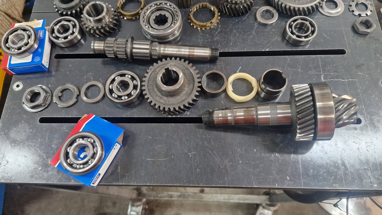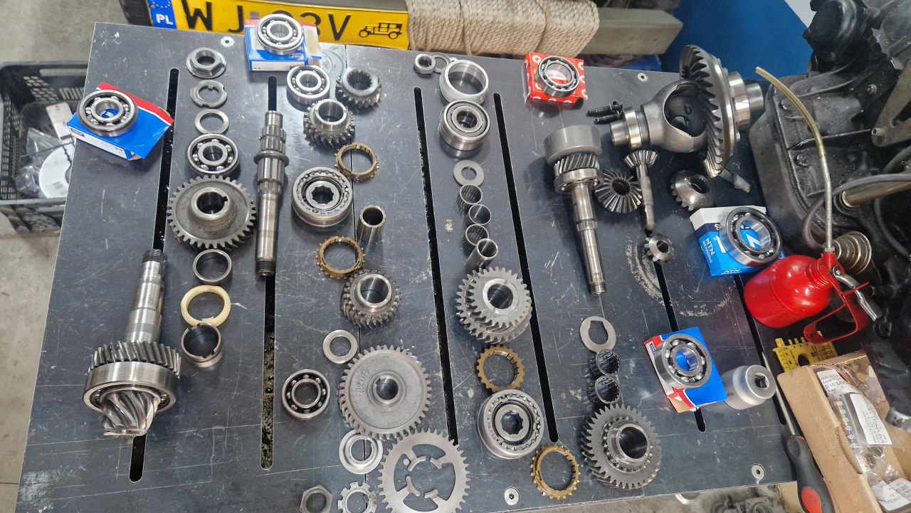 Po rozłożeniu skrzyni starannie umyłem wszystkie części wewnętrzne i obudowę. Wszystko sobie ułożyłem w kolejności składania. Potem zacząłem szukać do tego łożysk... i tu było trochę gorzej. Ze wszystkich łożysk z tej skrzyni da się kupić tylko 6. Reszta ma dość nietypowe wymiary, bo były robione dla Saaba na zamówienie. Jedyny pozytyw tej sytuacji jest taki, że akurat dwa hałasujące łożyska da się kupić, więc są szanse, że da się tą skrzynię naprawić.