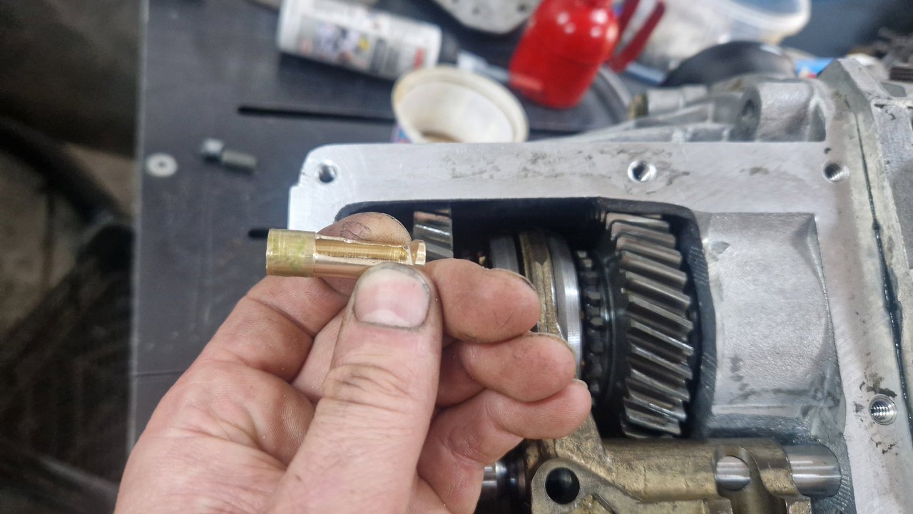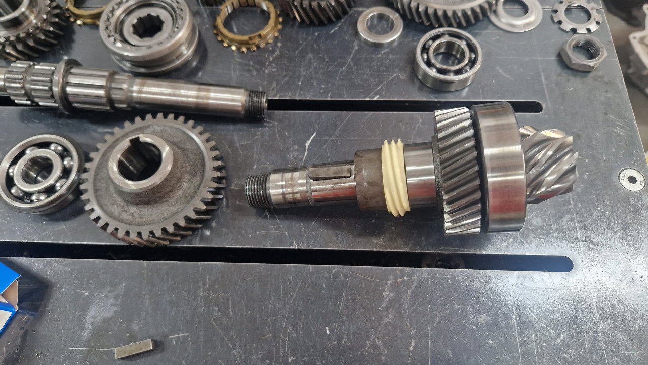 Włożyłem wałek do skrzyni i przełożyłem go przez łożysko, ale tak, żeby nie wystawał. teraz wkładam na miejsce koło napędzające i wsuwam wałek dalej. Podobnie zrobię z tym cienkim kółkiem ciernym po lewej. Te kółko ma o jeden ząb mniej niż koło już osadzone, i dociska się do niego. Dzięki temu cały czas to jest lekko hamowane, co podobno ma zmniejszać hałas skrzyni biegów.