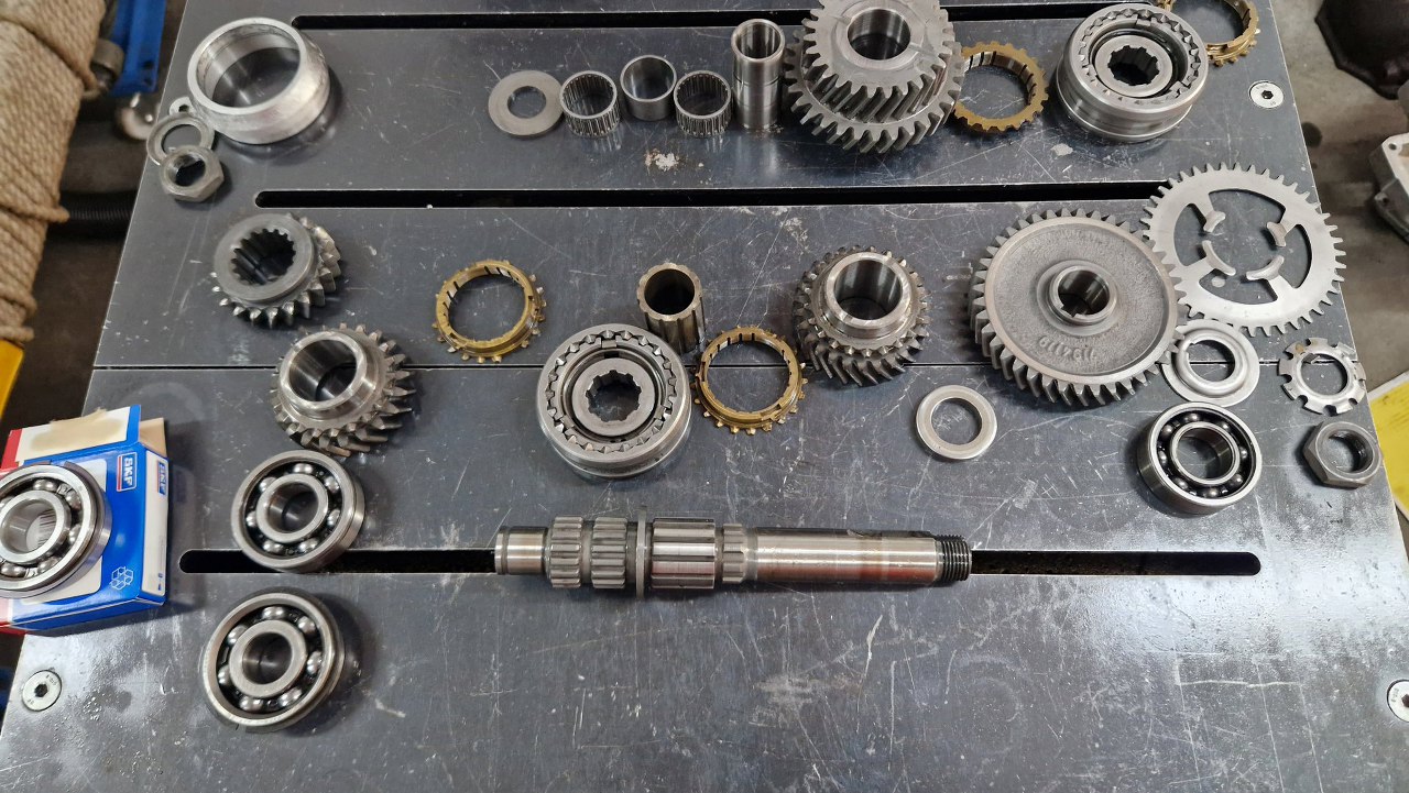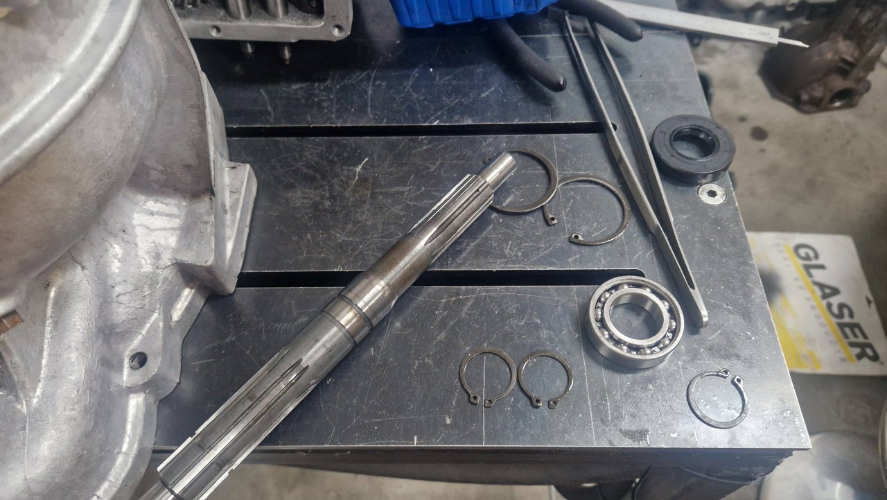 No dobra, nie użalamy się nad dostępnością części, jak miałoby być łatwo, to robiłbym stare traktory. Składam, zaczynając od końca, czyli wałka wyjściowego, który jest w skrzyni najgłębiej. Te łożysko po prawej to właśnie to z poprzedniego zdjęcia - ono zostaje.