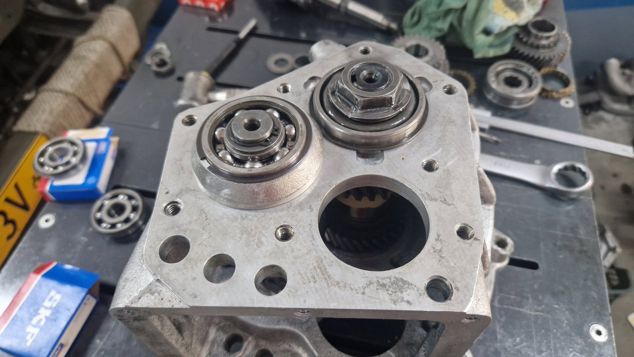Włożyłem wałek na miejsce, ale nie do końca - trzeba te koło zębate po lewej włożyć do skrzyni i dopiero tam przełożyć przez nie wałek. Na koniec zakładam łożysko po lewej stronie obudowy.