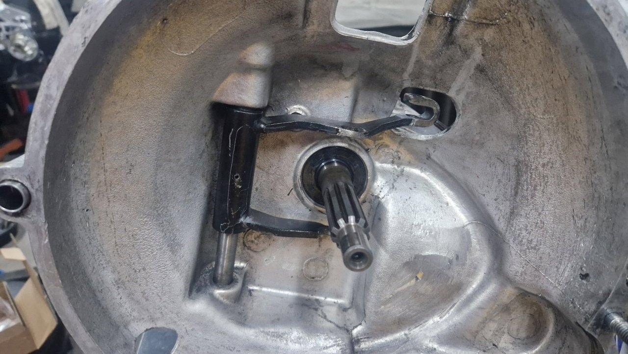 I włożone. Gwinty później wkręcę w tylną pokrywę skrzyni, pokręcając nimi regulujemy położenie neutralne widełek.