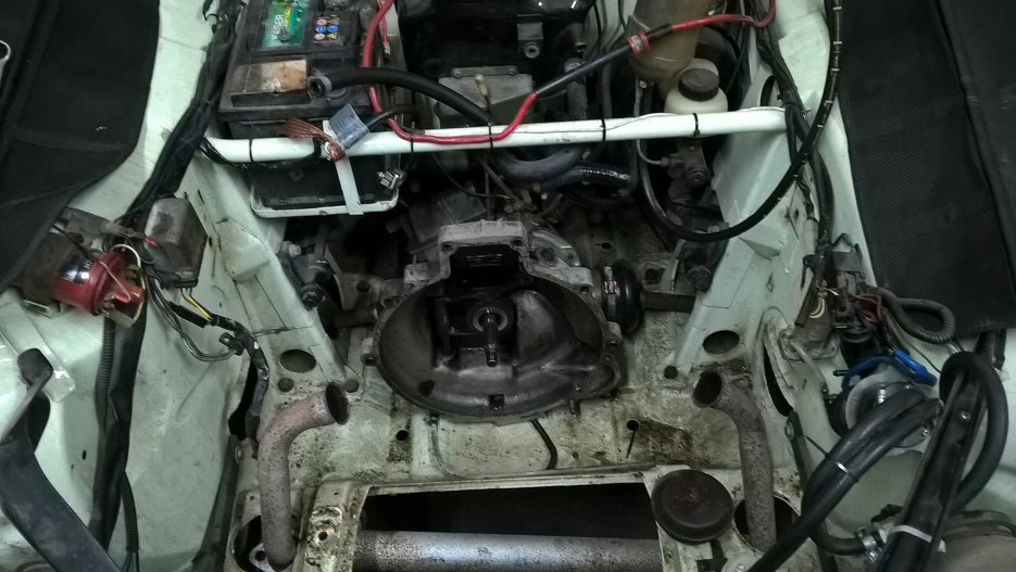 Zaczynam od sprzęgła. Trochę tu pod maską ciasno. Przyzwyczajony do luksusów przestrzeni w Fordach, albo dostępu do silnika w Saabach Sonettach, tu mam lekką klaustrofobię... Widać też kilka patentów, jak zbiorniczek wyrównawczy nie przy chłodnicy a na dmuchawie nawiewu, elektryczną pompę paliwa i inne drobiazgi.