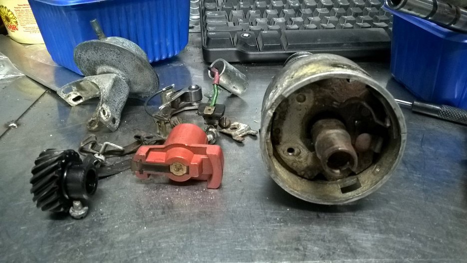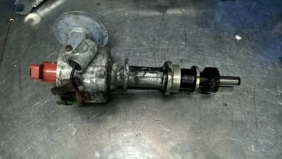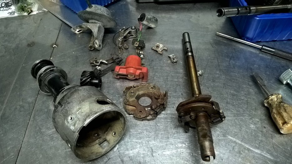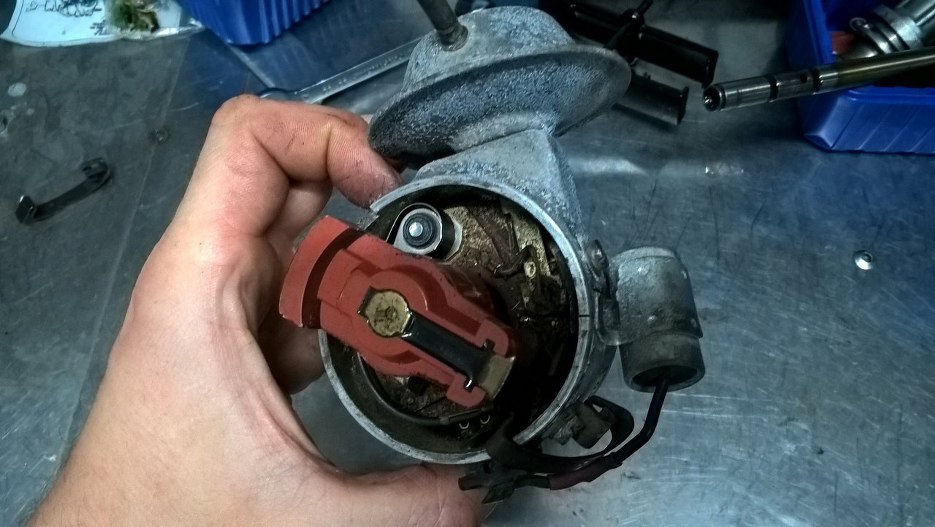 Problemy z gaźnikiem postanowiłem rozwiązać w nieco inny sposób. Zajrzałem z wierzchu do aparatu zapłonowego, a tam - widać, że nie jest dobrze. Z wierzchu można jeszcze przeżyć jego wygląd: