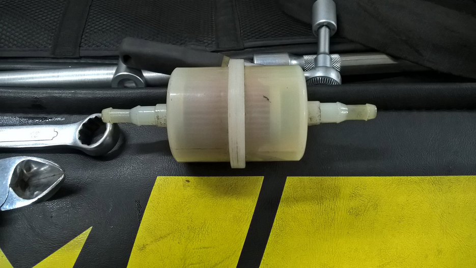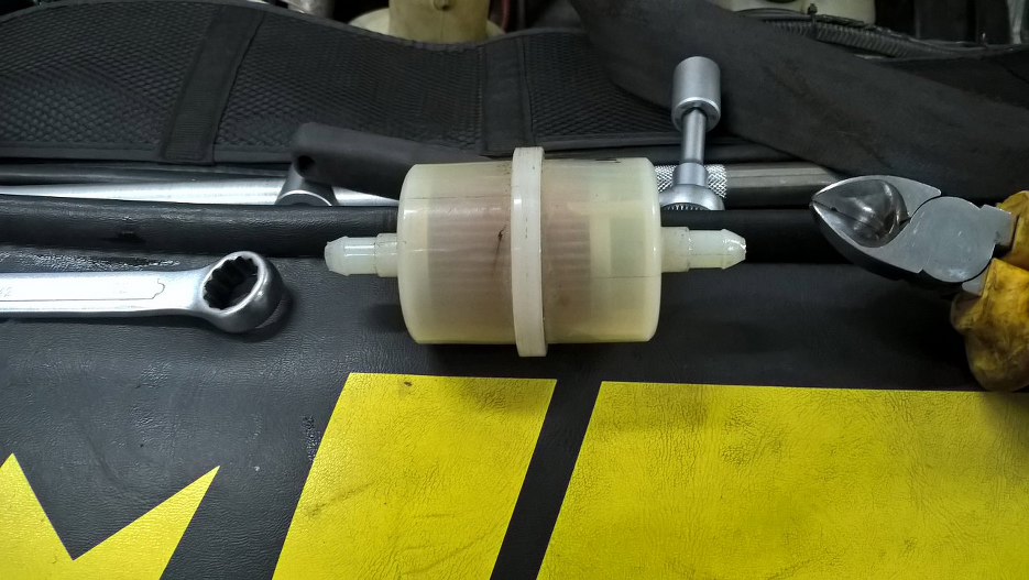 Zdemontowałem przewody paliwowe z elektrycznej pompy. Samą pompę na razie zostawię na wszelki wypadek (odłączę ją oczywiście), gdyby coś się stało z mechaniczną. Potem będzie można ją zdemontować. Filtr paliwa zostaje, bo wygląda na czysty, ale ktoś zakładając go zostawił go tak, jak się kupuje taki filtr.