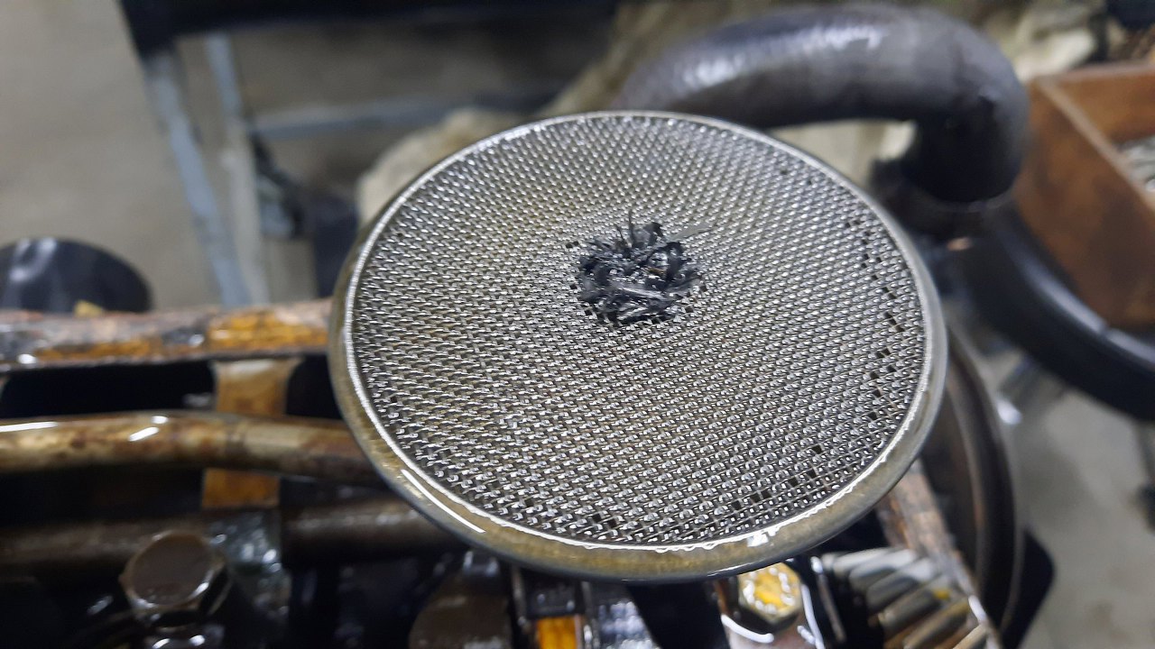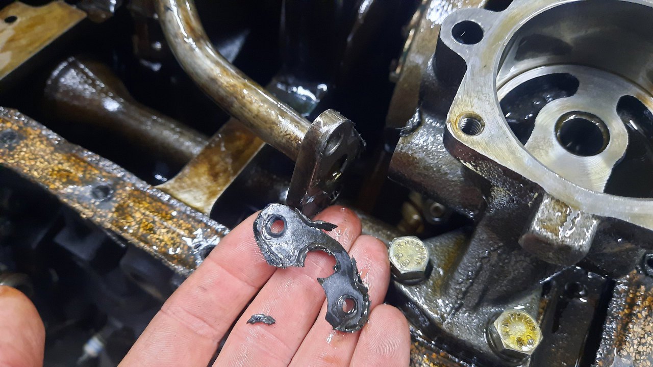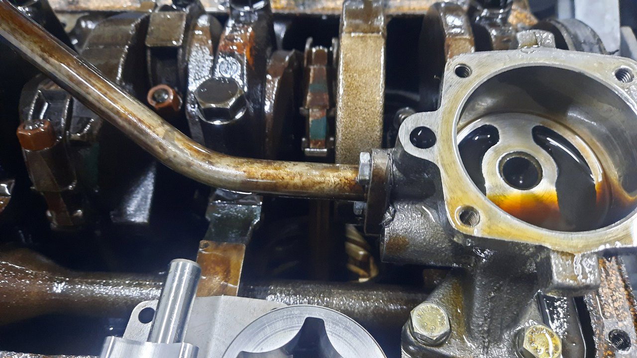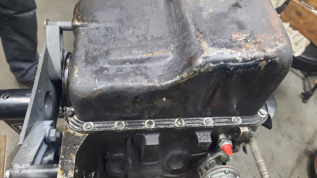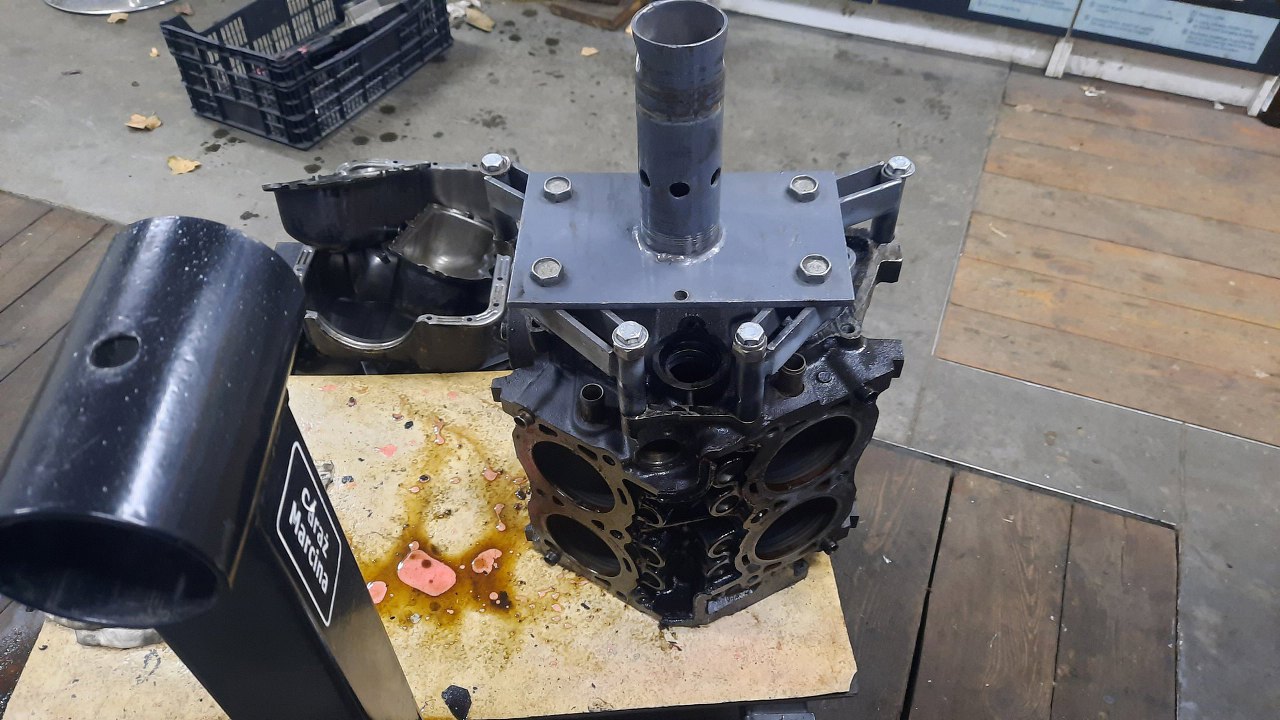 Silnik wyjęty, ciekawość mnie ciśnie co z tym ciśnieniem oleju jest? Wrzuciłem go od razu na stojak. Po zlaniu oleju odwracam, żeby zajrzeć do miski oleju, a tam...