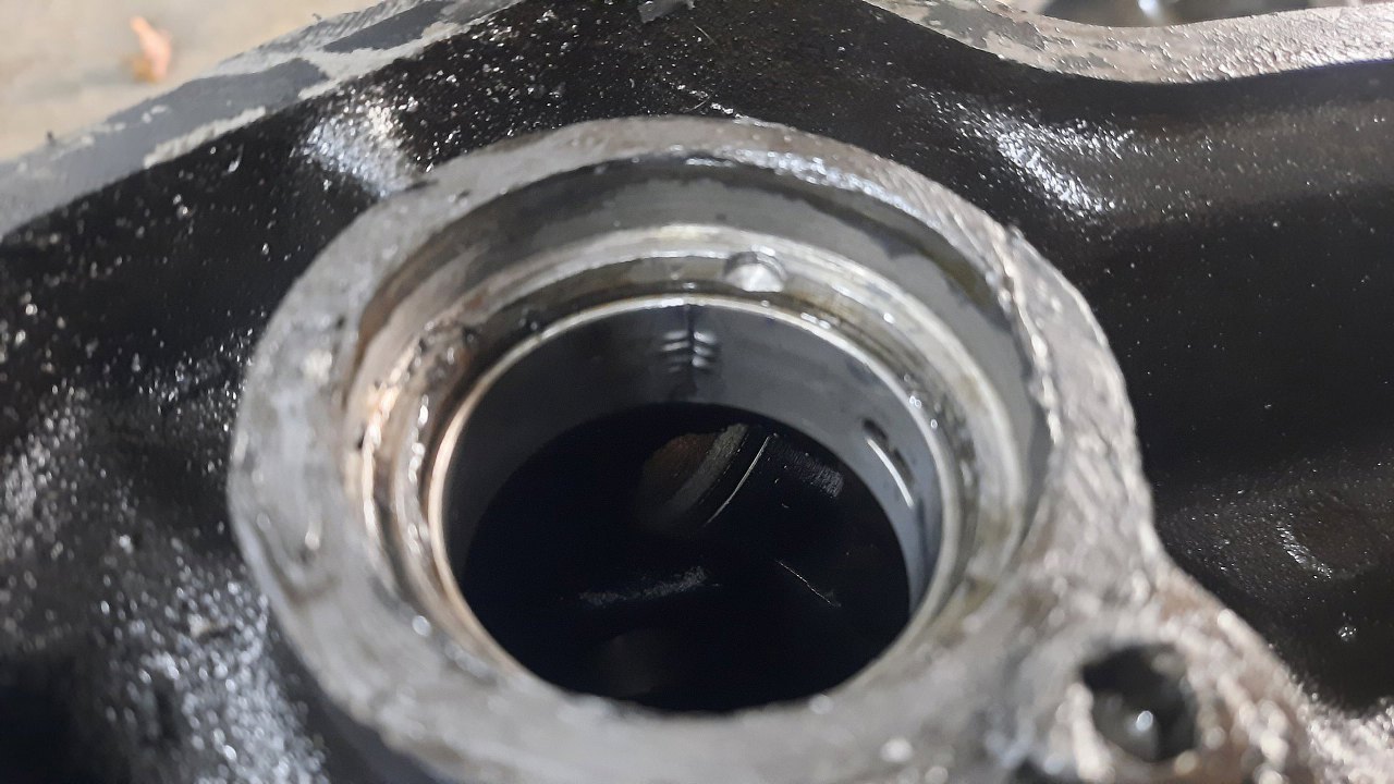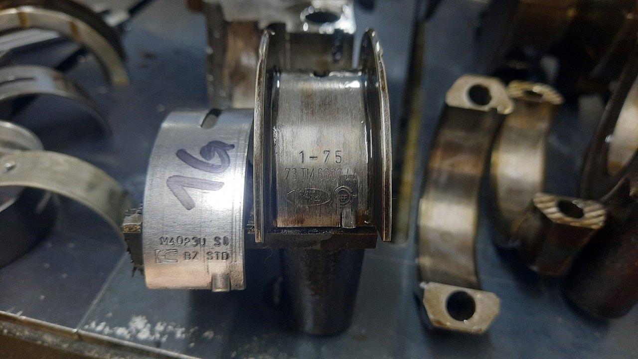 Co ciekawe, panewki główne, te ze zintegrowanymi oporowymi, są wciąż oryginalne - widać znaczki Forda. Reszta rzeczywiście była wymieniona. Te oryginalne są i tak w idealnym stanie, więc nie jest to problemem. A potem w częściach, które przywiózł właściciel, znalazłem takie nowe oporowe. Nie mam pojęcia, czemu nie zostały włożone.