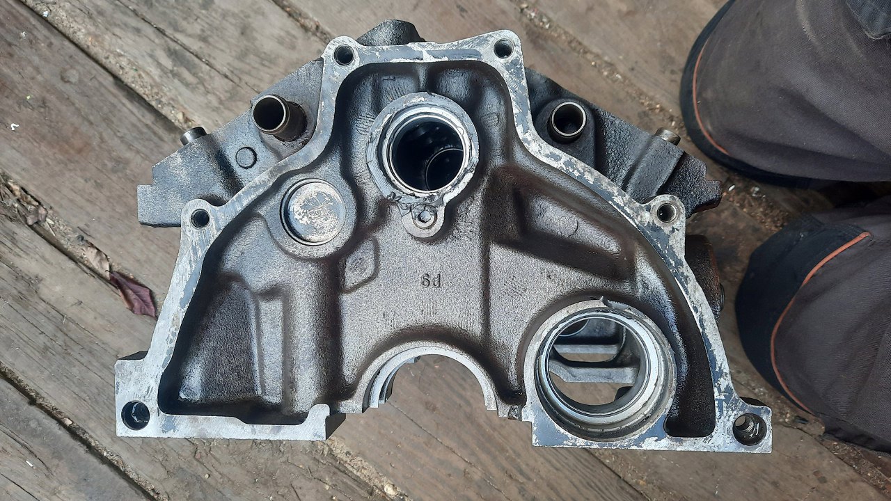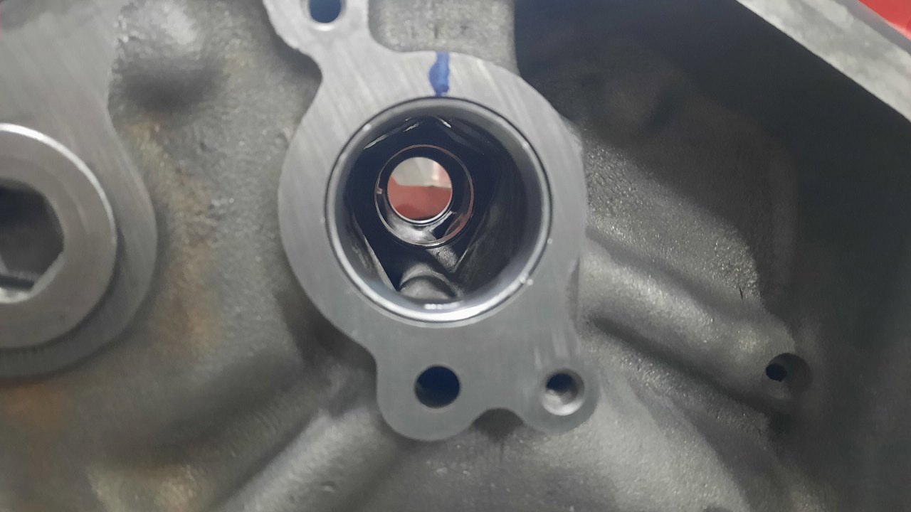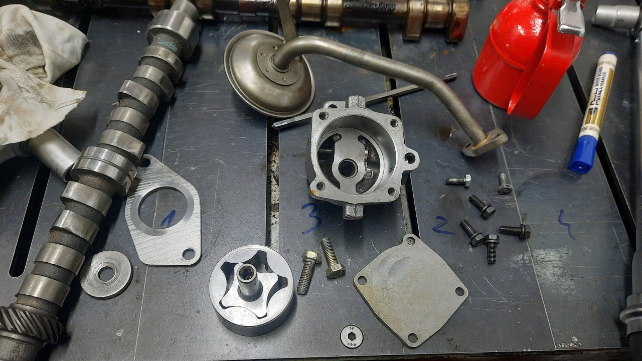 Korpus pompy przykręcony na miejsce, koła zębate w środku. Posmarowałem to smarem montażowym, żeby pompa szybko zassała olej za pierwszym razem.