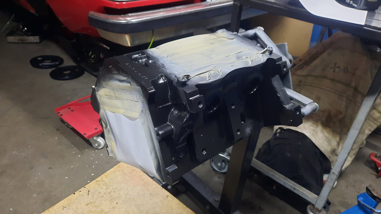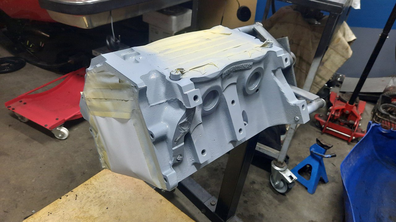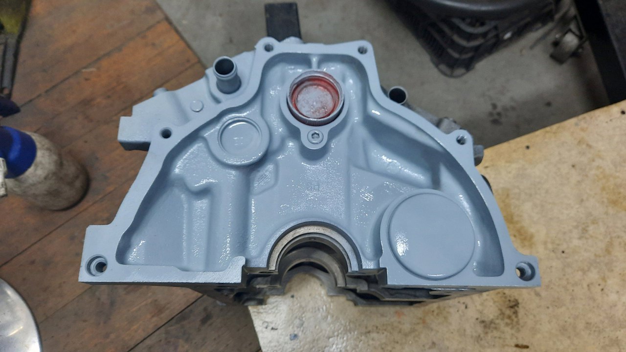 Po oczyszczeniu umyłem blok ponownie i odtłuściłem. Najpierw pomaluję go z tyłu, żeby potem powiesić go na stojak. Zaślepka otworu na wałek wyrównoważający tu jest użyta jako zaślepka do malowania, bo już się do niczego nie nadaje. Były wkręcone za długie śruby miski oleju i ją wygięły. Stąd też spory wyciek z tego miejsca.