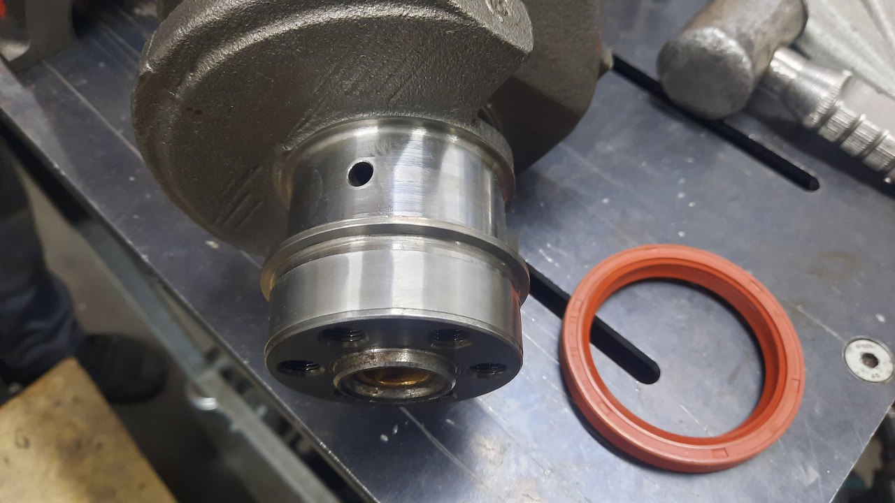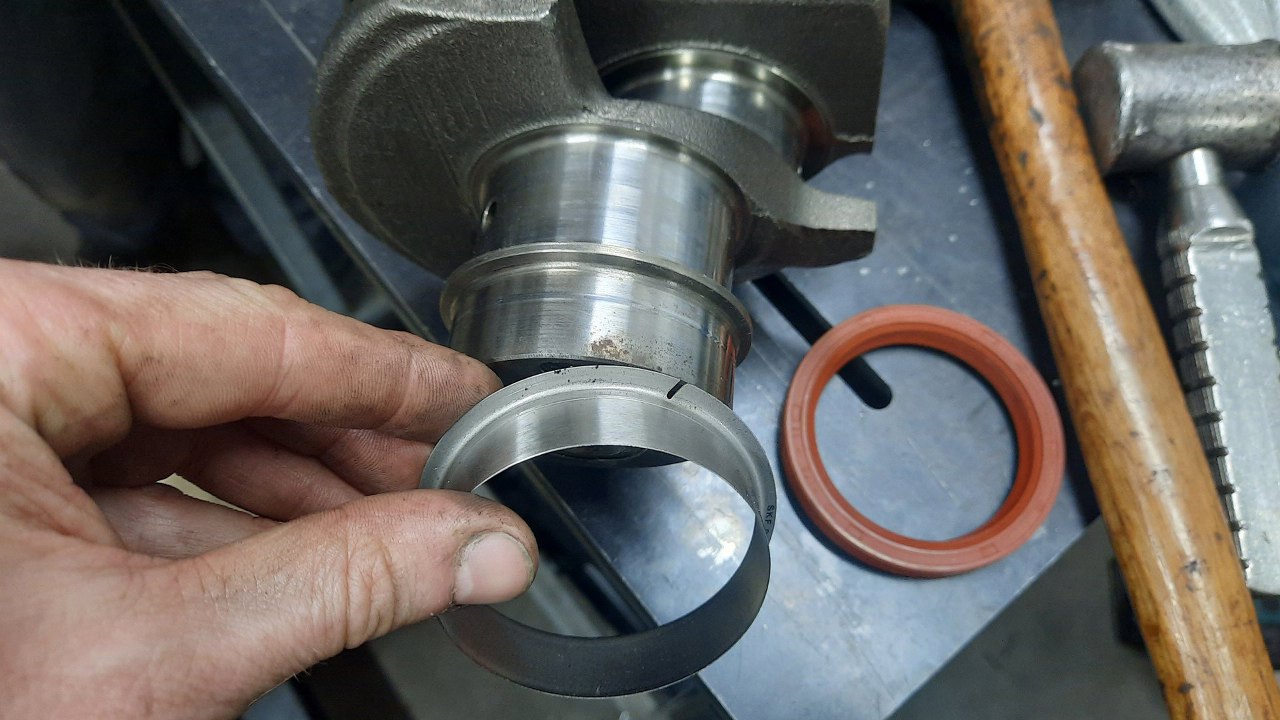 Tylna płaszczyzna wału korbowego, po której ślizga się uszczelniacz, była nieco wytarta przez stary, sztywny uszczelniacz. Założę tu tuleję naprawczą.